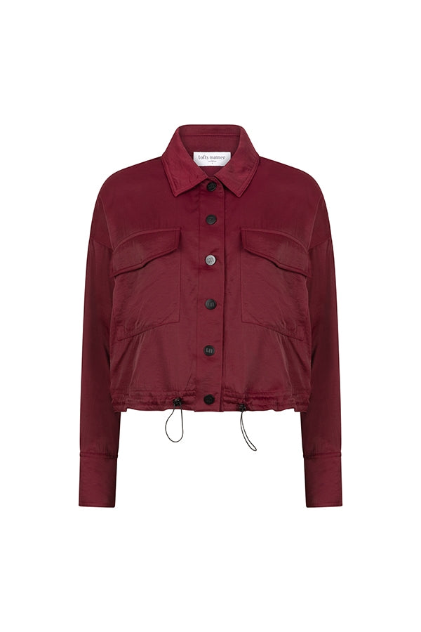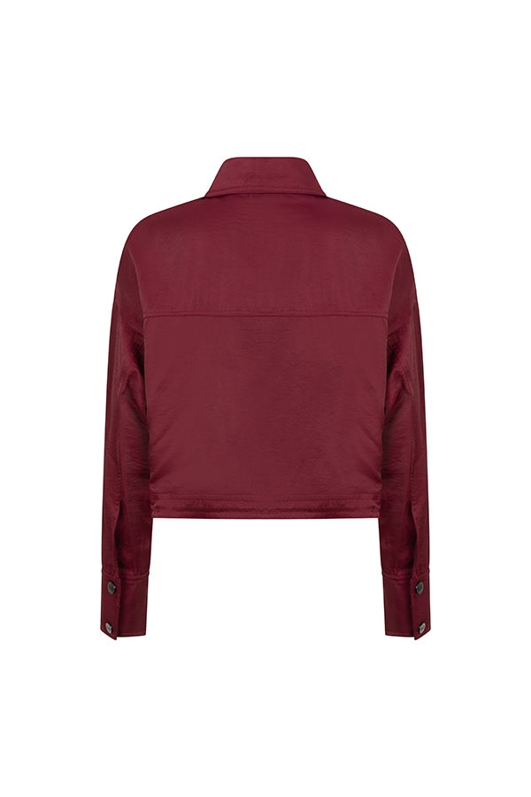 La blouse Tilde est une blouse bordeaux en tissu satiné. Elle est dotée de poches poitrine, de boutons sur toute la longueur et d'une taille élastique avec cordons de serrage. Sa coupe est droite.