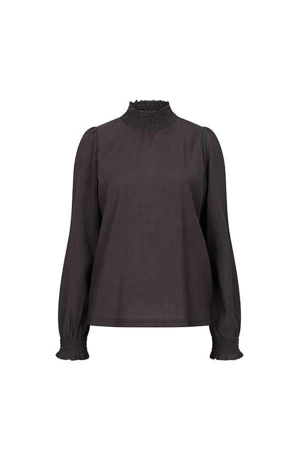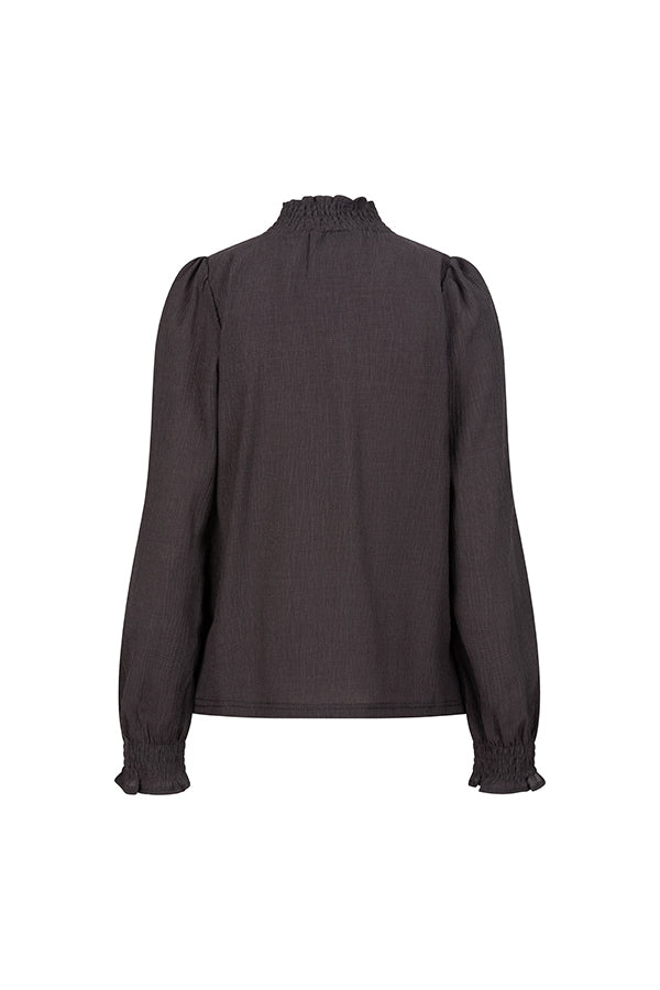 La blouse Tilde est une blouse noire en tissu satiné. Elle est dotée de poches poitrine, de boutons sur toute la longueur et d'une taille élastique avec cordons de serrage. Sa coupe est droite.