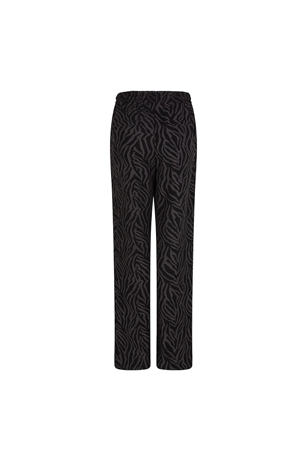 Le pantalon Ida est noir et arbore un imprimé zèbre. Il est doté d'une taille smockée avec cordon de serrage, de poches latérales et passepoilées, et est très extensible. Ce pantalon noir et gris présente une coupe droite.