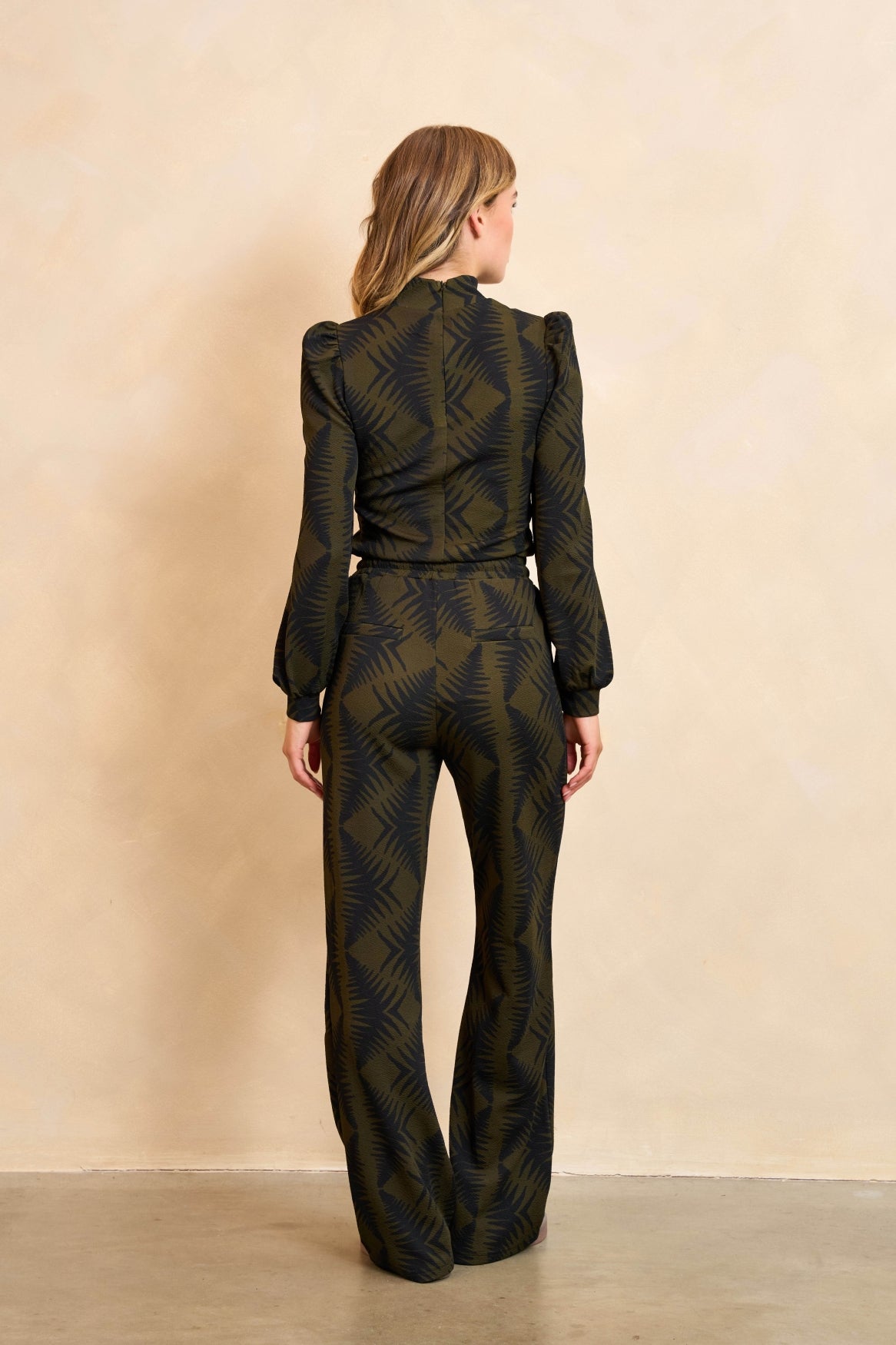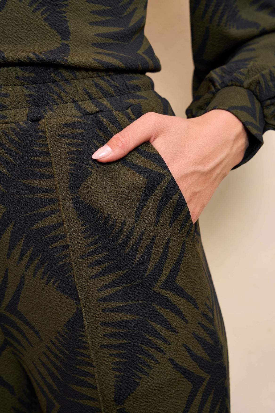 Le pantalon Liv est un pantalon sportif imprimé. Il présente une couture décorative sur le devant et une taille élastiquée à smocks avec cordon de serrage. Ce pantalon sportif possède des poches latérales et passepoilées et est confectionné dans un tissu résistant. Ce pantalon vert est généreusement extensible et présente une coupe droite.