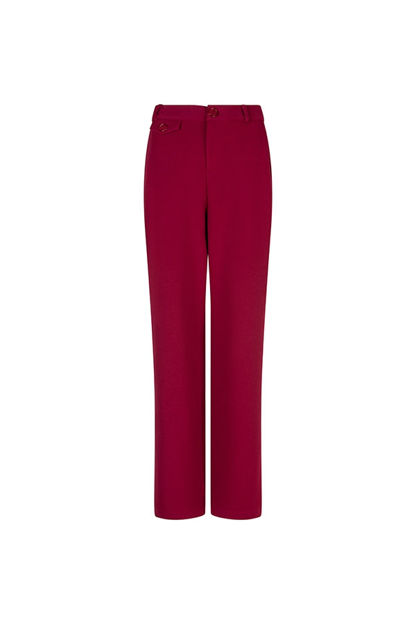 Le pantalon Nathalia est un pantalon droit rouge profond avec des poches latérales devant et de fausses poches à l'arrière. De plus, le pantalon est doté de passants de ceinture, d'une ceinture amovible et est fabriqué dans un tissu finement extensible.