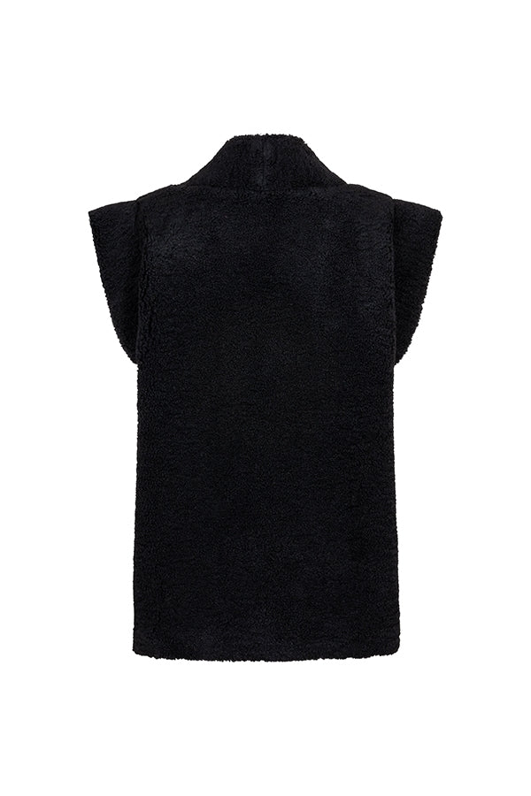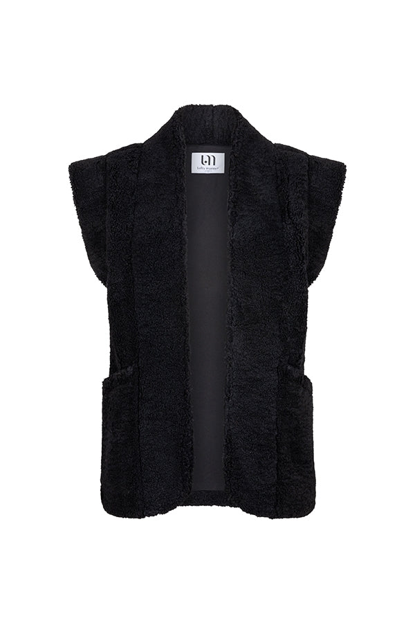 Gilet Alice est un gilet carré fabriqué dans un tissu peluche doux. Le gilet noir a des mancherons, des poches latérales et une coupe oversize.