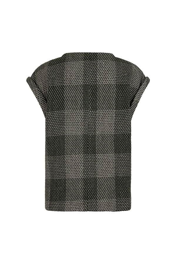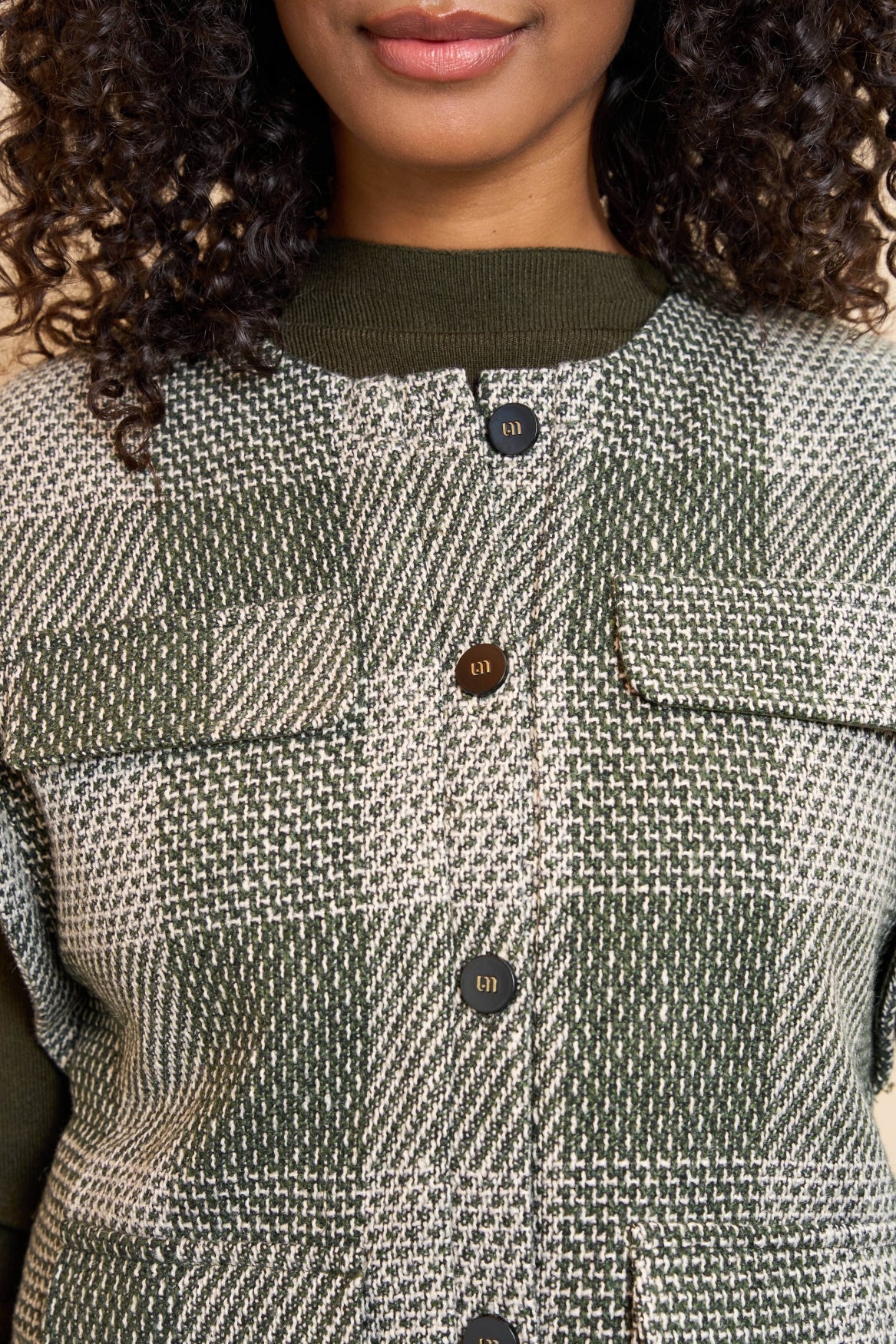 Le Gilet Lotta est un gilet vert à carreaux. Il possède des manches retroussées et des poches à rabat sur le devant. Sa fermeture à boutons permet de le porter ouvert ou fermé. Ce gilet vert présente une coupe ample.