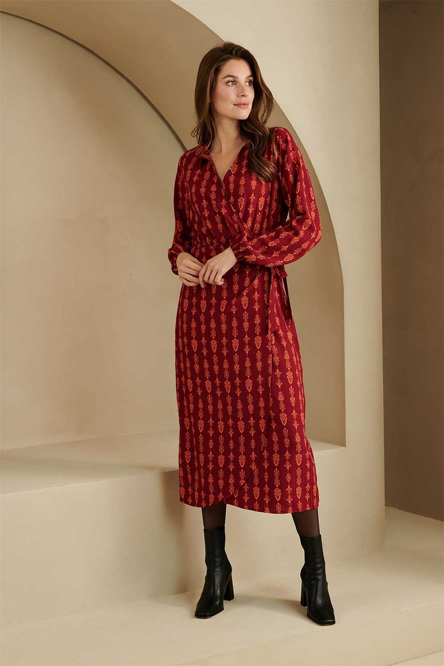 La robe Keyla est une robe midi rouge avec un col classique et un détail portefeuille à la taille. La robe peut être boutonnée sur le côté gauche et possède des élastiques aux extrémités des manches.