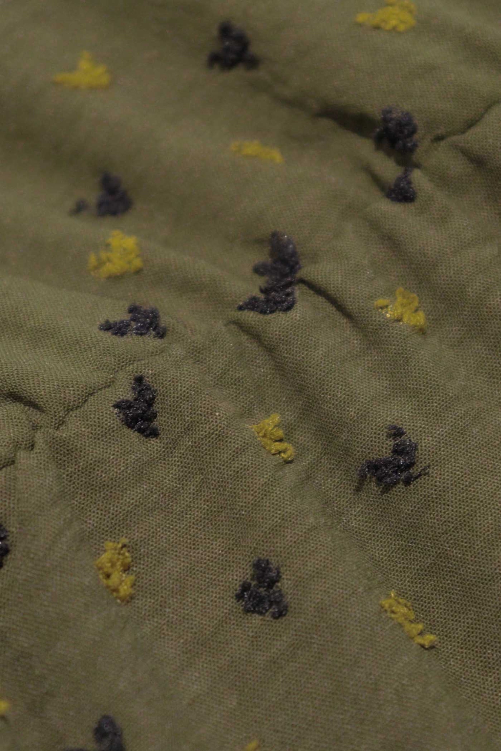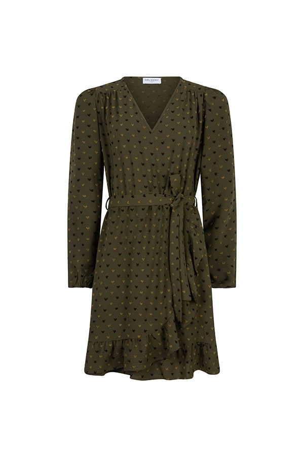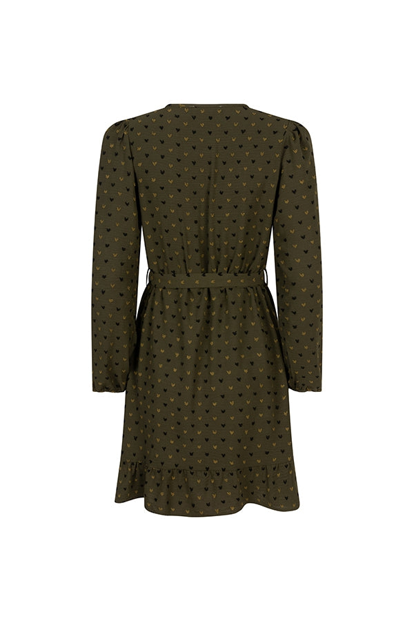 La robe Rayne est une robe verte avec un col en V et un élastique à la taille. La robe a des manches longues avec des extrémités élastiques et un détail cache-cœur au bas. La bandoulière est amovible.