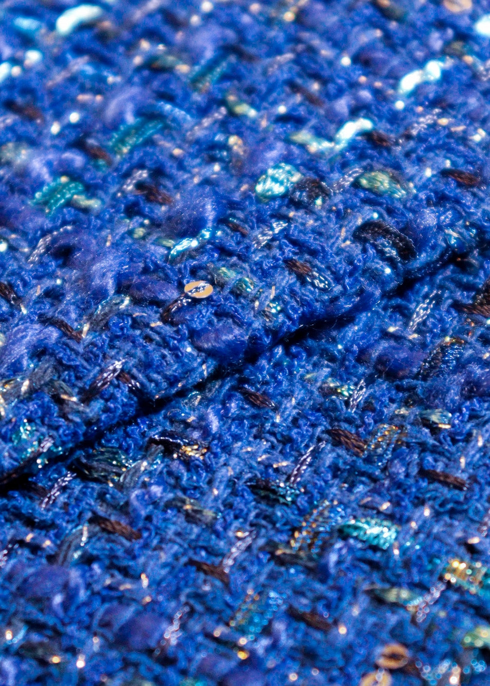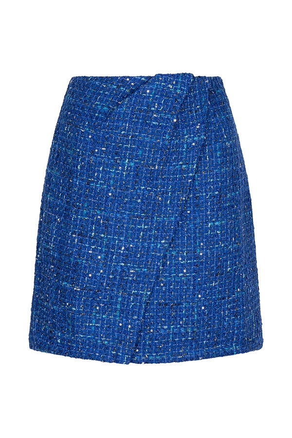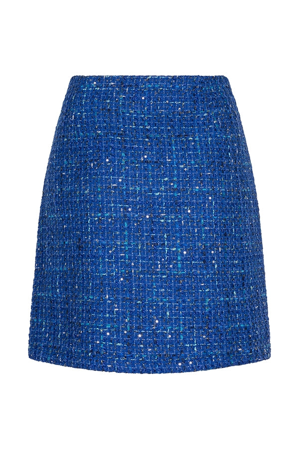 La jupe Ashley est une jupe en tweed bleu avec des détails portefeuille. La jupe bleue a une fermeture éclair invisible sur le côté et a une coupe droite.