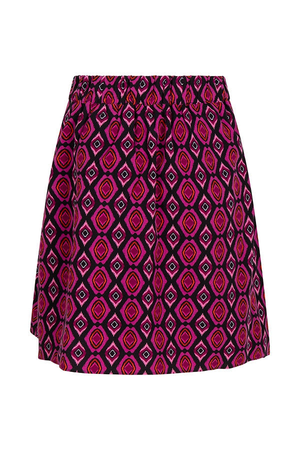 Rok Inda is een gekleurde rok met een blinde rits aan de zijkant en een plooidetail aan de voorkant. In de taille zit elastiek.