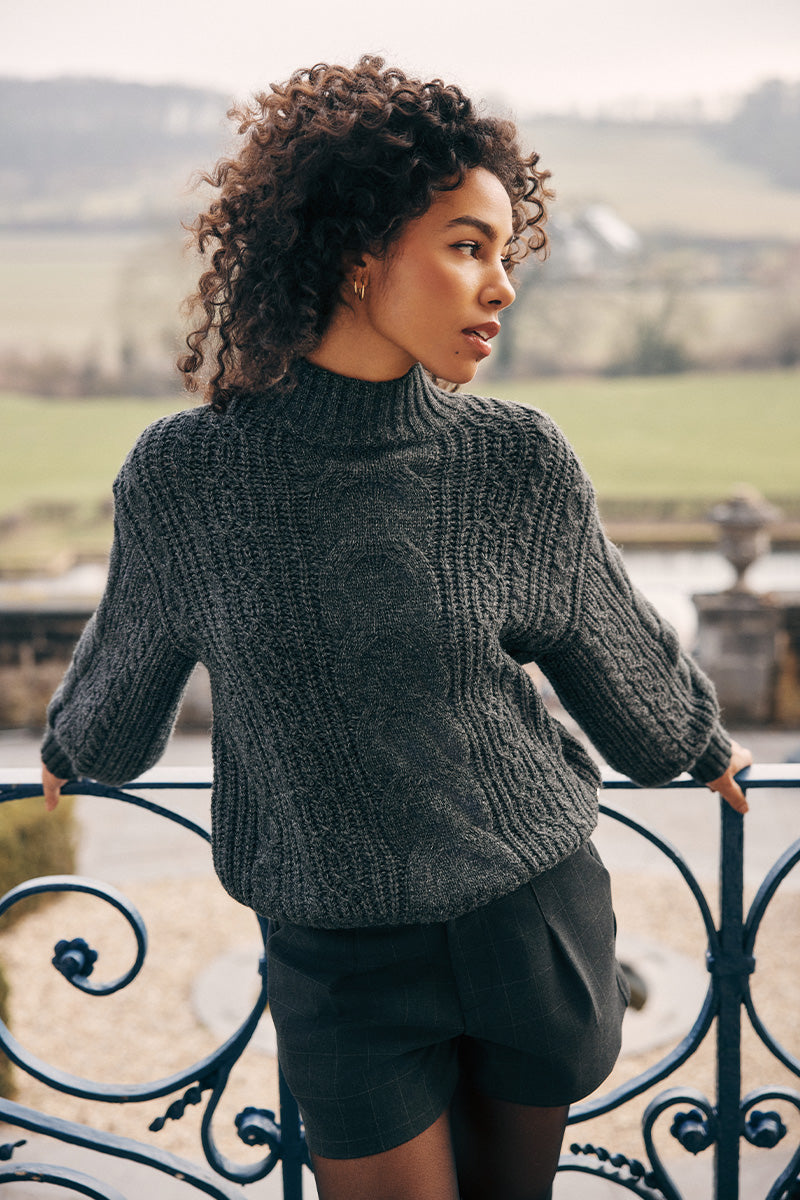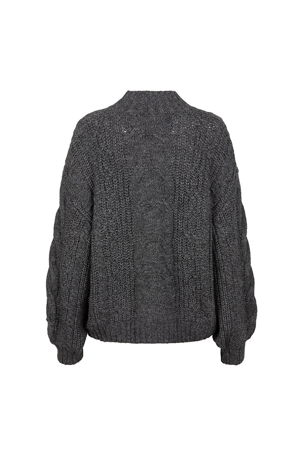 Le pull Dagmar est un pull en maille grise. Il présente un col montant, des manches volumineuses et une structure en maille torsadée. Il présente une coupe oversize.
