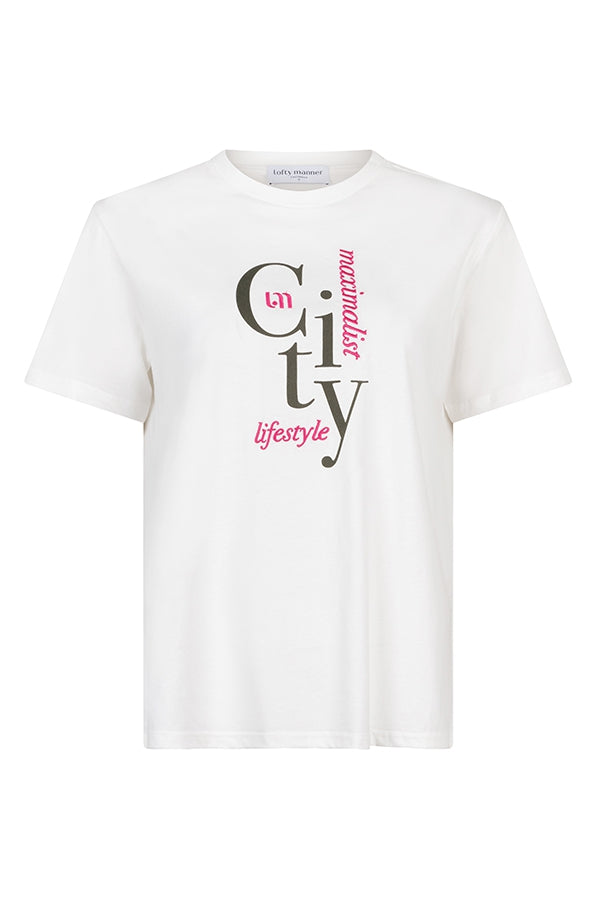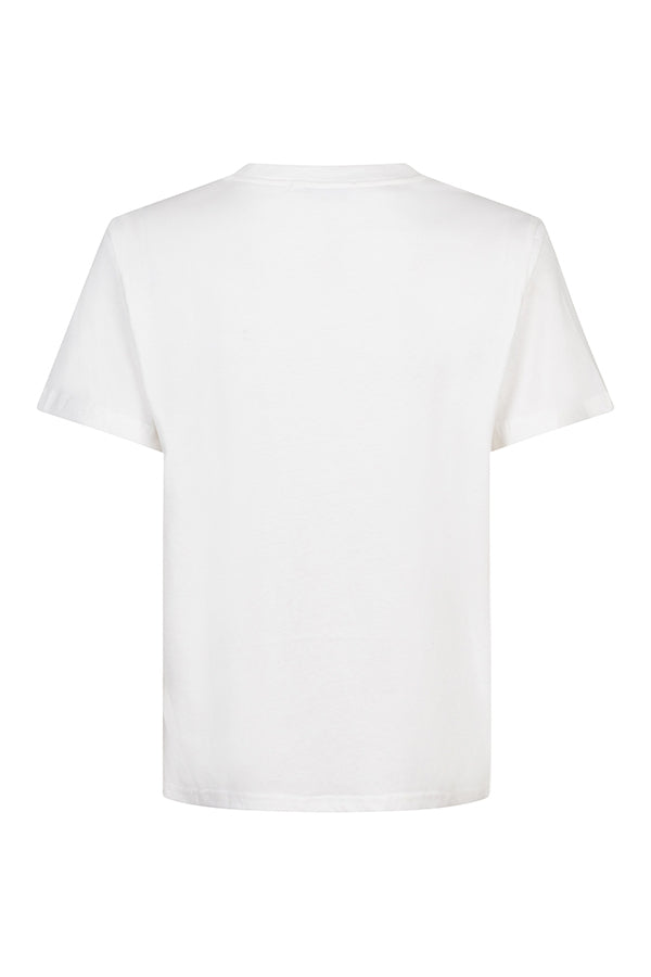 Le T-shirt Jaida est un T-shirt blanc à col rond montant et manches courtes. Le modèle à coupe droite présente une œuvre d'art saisissante sur le devant.