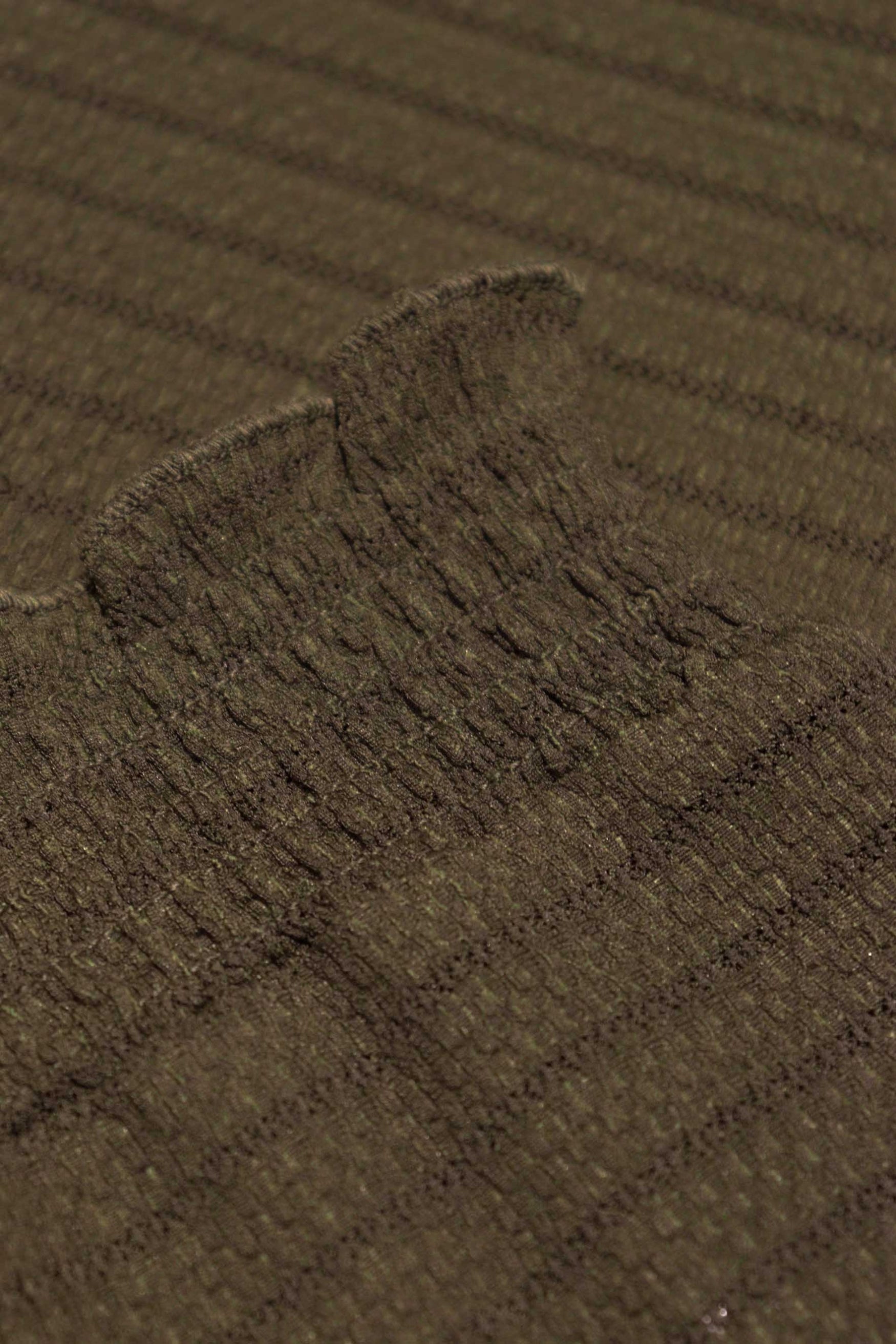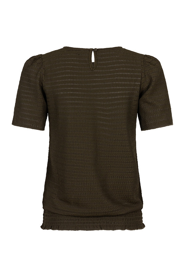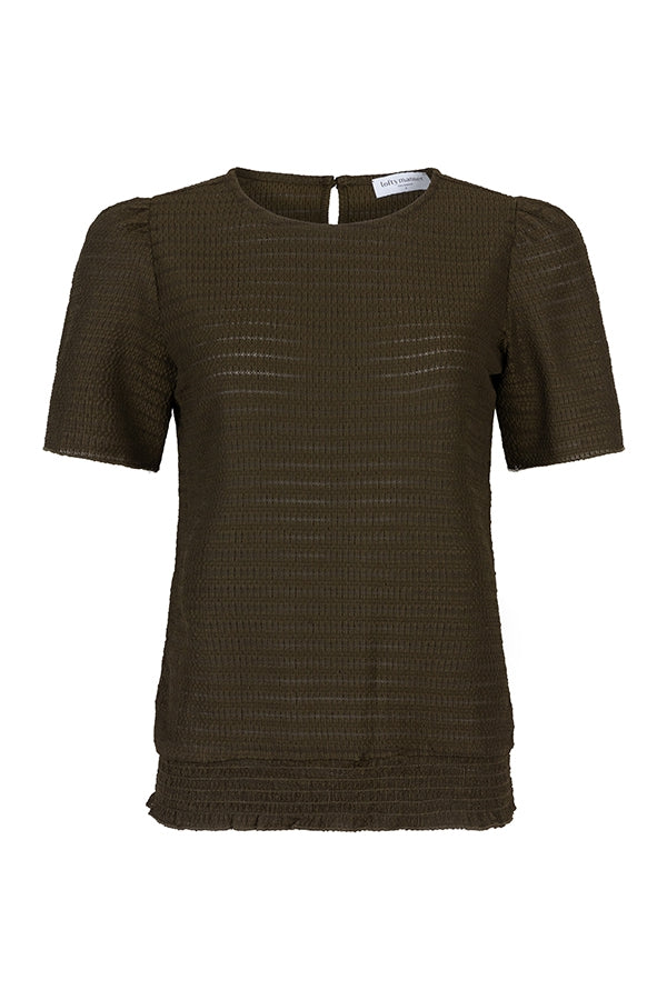 Le top Alexia est un haut vert avec un col rond montant et des manches courtes amples qui tombent au-dessus du coude. Le haut vert a une bande smockée en bas et un bouton fendu au dos.