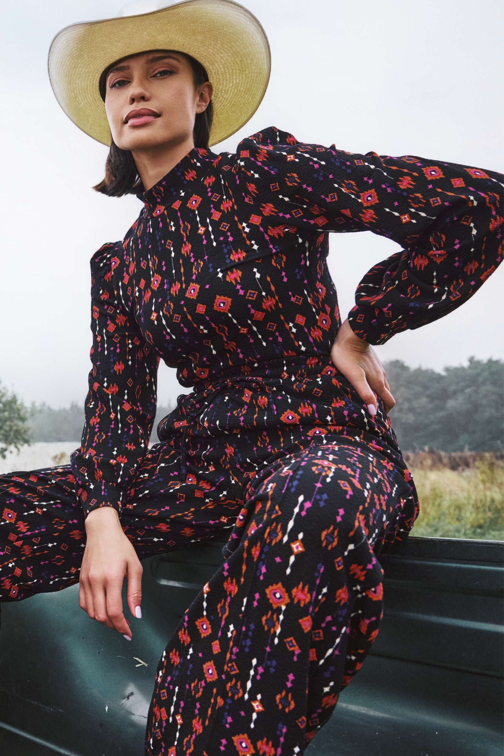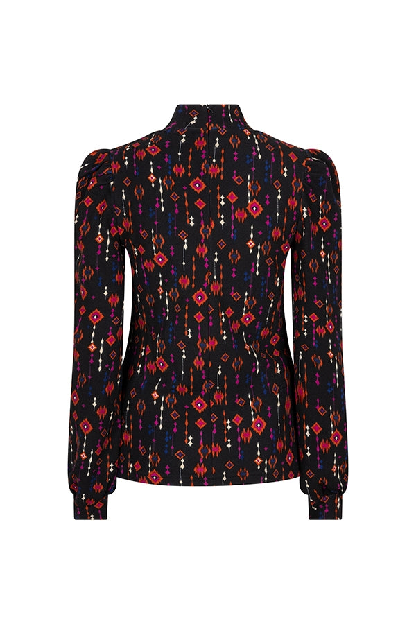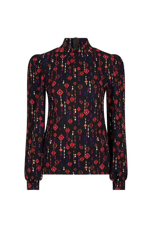 Top Eve est un haut ajusté confectionné dans un tissu extensible épais. Le haut noir a des manches bouffantes, un col montant et une fermeture éclair au dos.