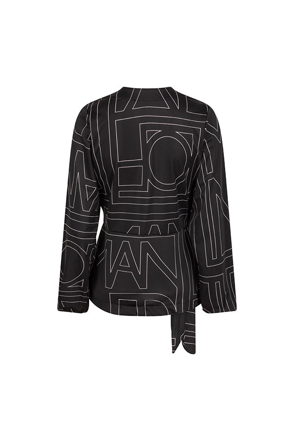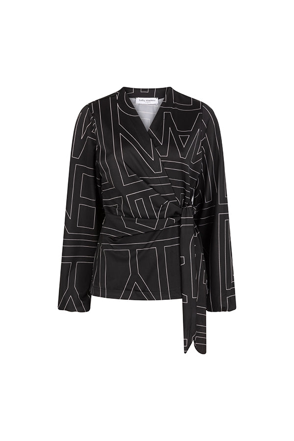 Le haut Hazel est un haut cache-cœur noir au motif graphique. Il présente un nœud sur le côté gauche et est confectionné dans un tissu fin et extensible. Ce haut noir présente une coupe droite.