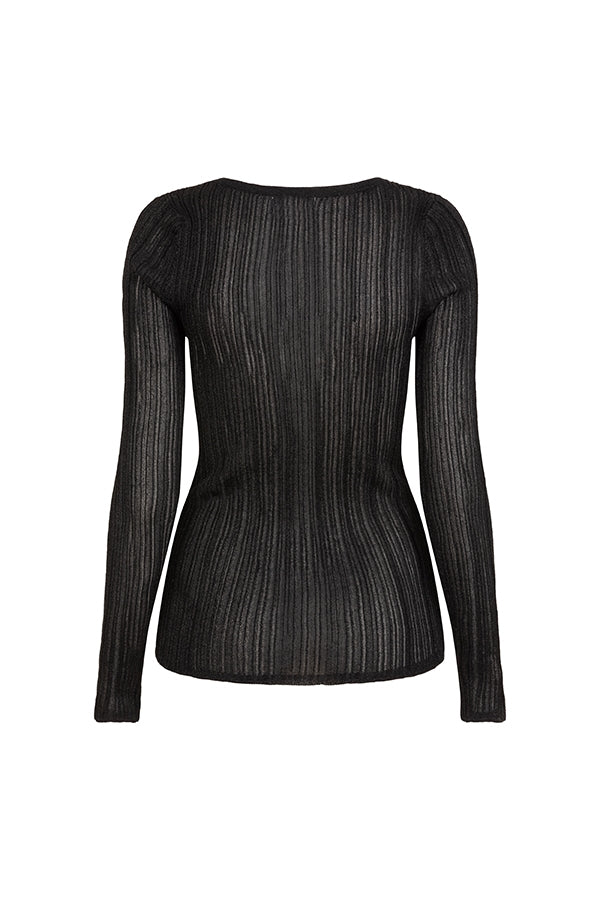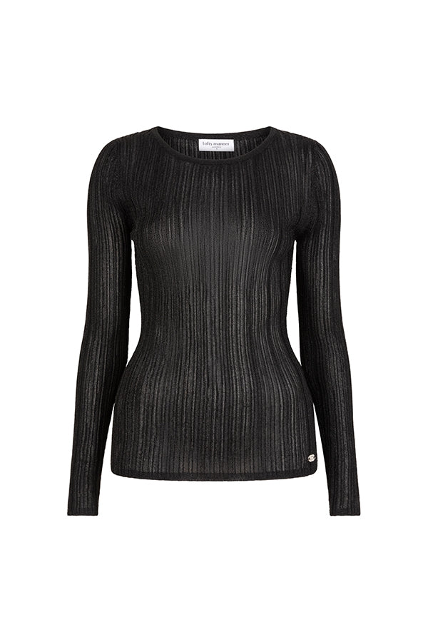 Le haut Mabel est un haut noir en maille. Il présente une encolure ronde et des détails en lurex subtilement chatoyants. Ce haut noir présente une coupe ajustée.