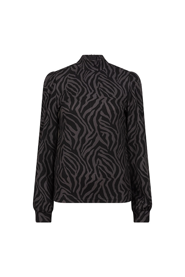 Le haut Maren est un haut noir à imprimé zèbre gris. Il présente un col montant, des poignets ajustés et des manches bouffantes. Confectionné dans un jersey confortable et extensible, ce haut à imprimé zèbre présente une coupe ajustée.