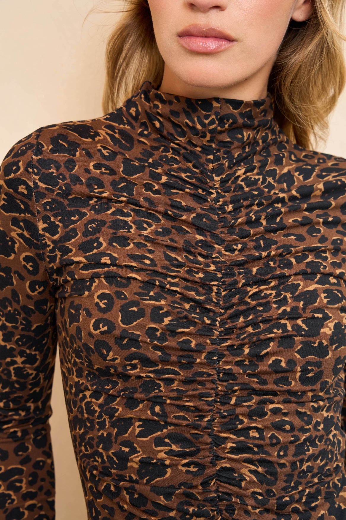 Le haut Margaret est un haut marron à imprimé léopard. Il présente un col montant, un effet plissé à la poitrine et est confectionné dans un tissu doux et confortable. Il présente une coupe ajustée et une grande élasticité.
