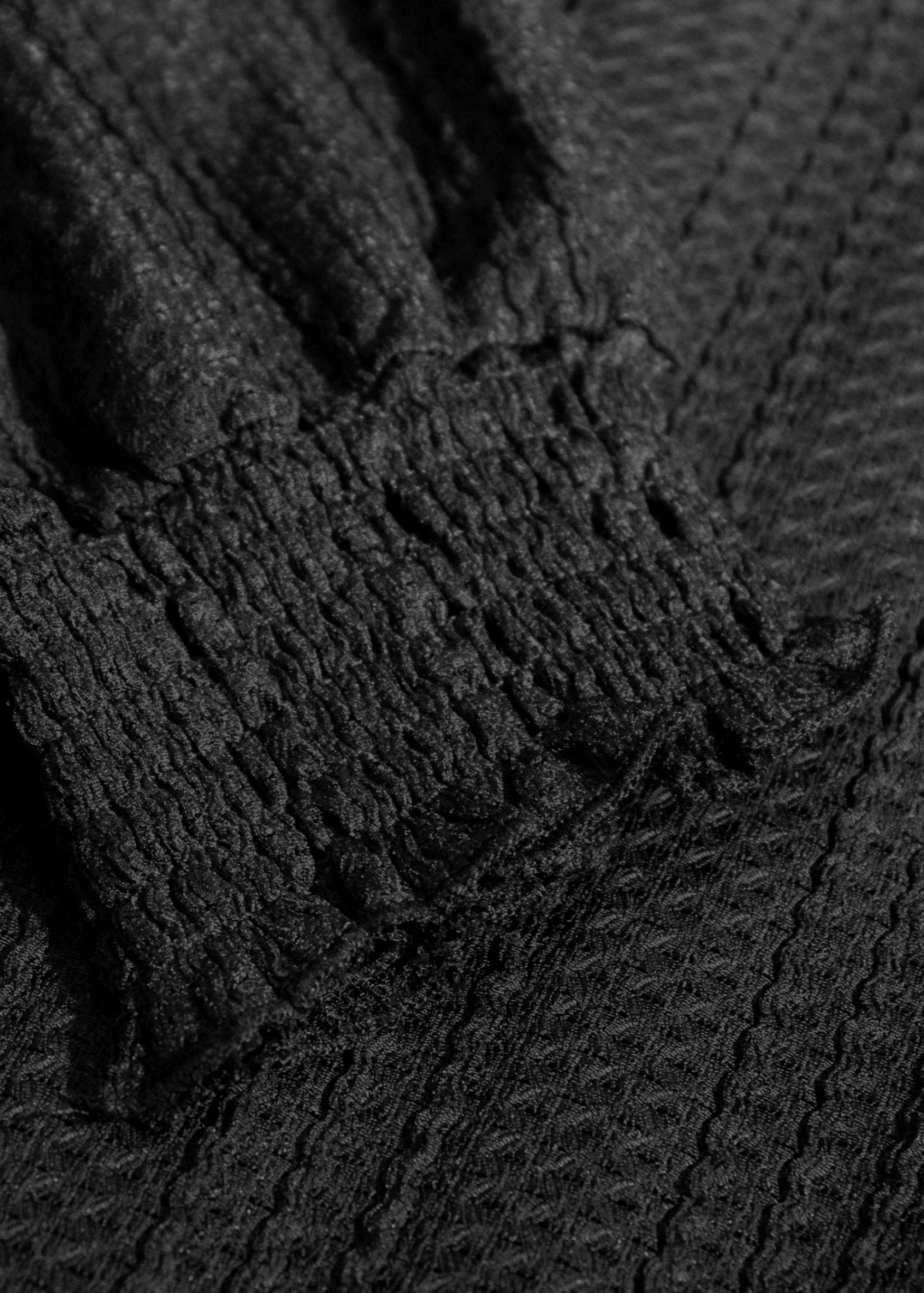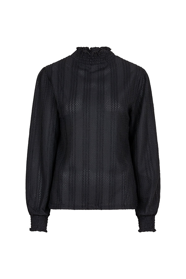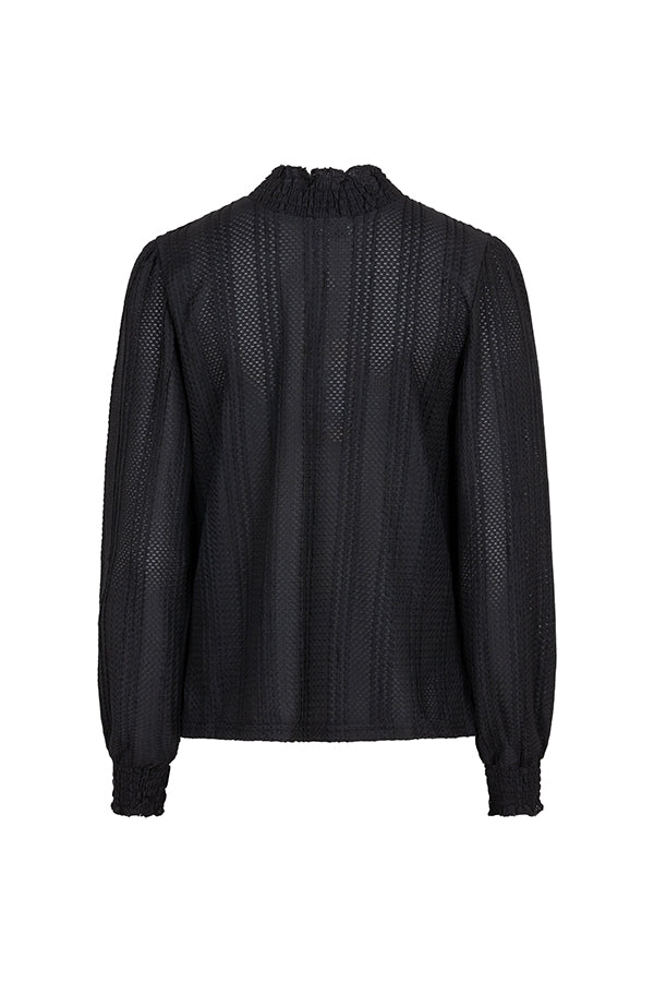Top Sadie est un haut ajusté avec une structure dans le tissu et des manches bouffantes. Le haut noir a un col smocké haut ainsi qu'une bande smockée aux extrémités des manches. Le haut est très extensible.