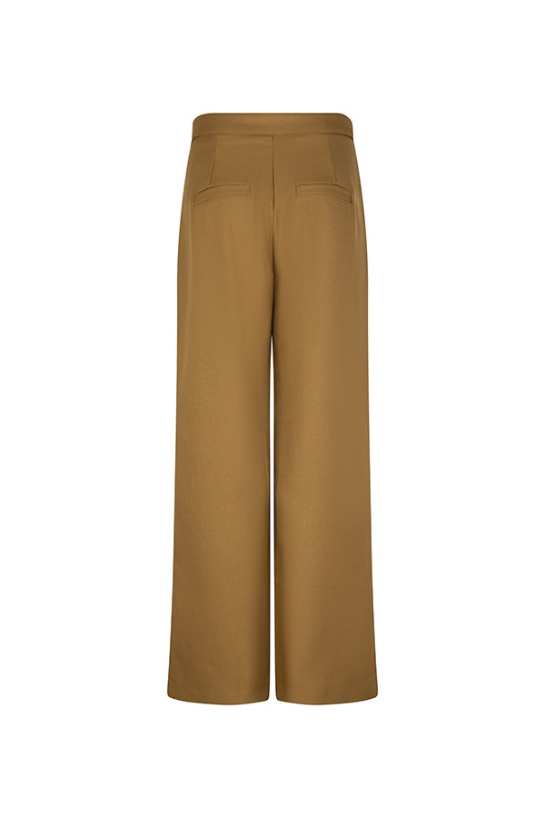 Le pantalon Amelia est vert et orné d'un bouton à la taille. Il possède des poches latérales fendues et des poches décoratives à l'arrière. Il est également doté d'une fermeture à crochets et à œillets, d'une fermeture éclair et d'une coupe droite.