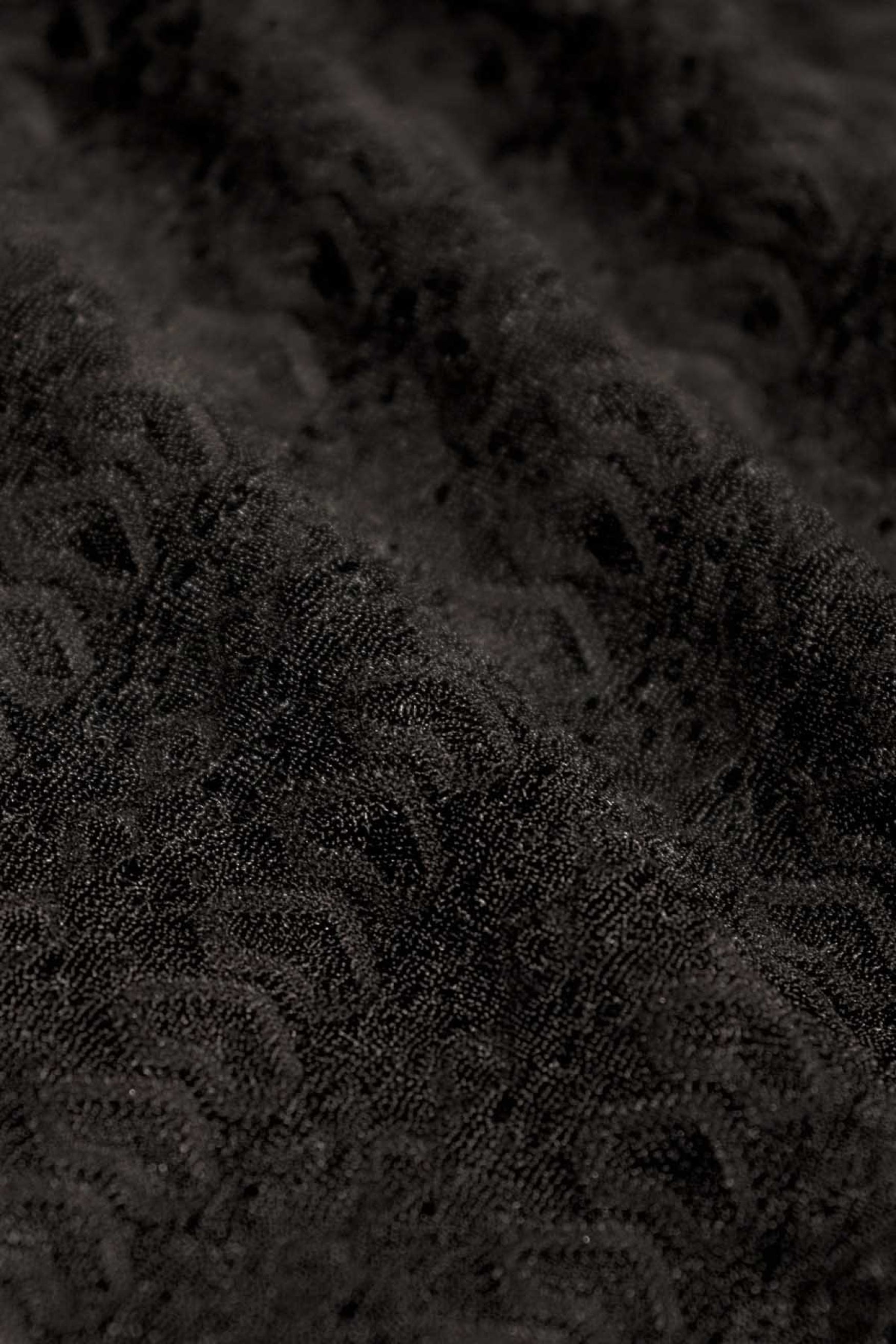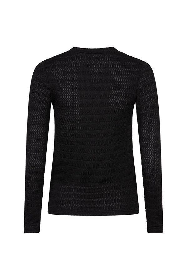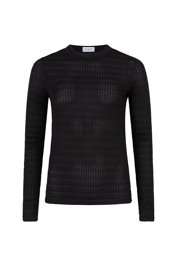 Le pull Lenore est un pull noir à col rond haut, coupe près du corps et confectionné dans un tissu extensible. Il y a un motif dans le tissu du pull.