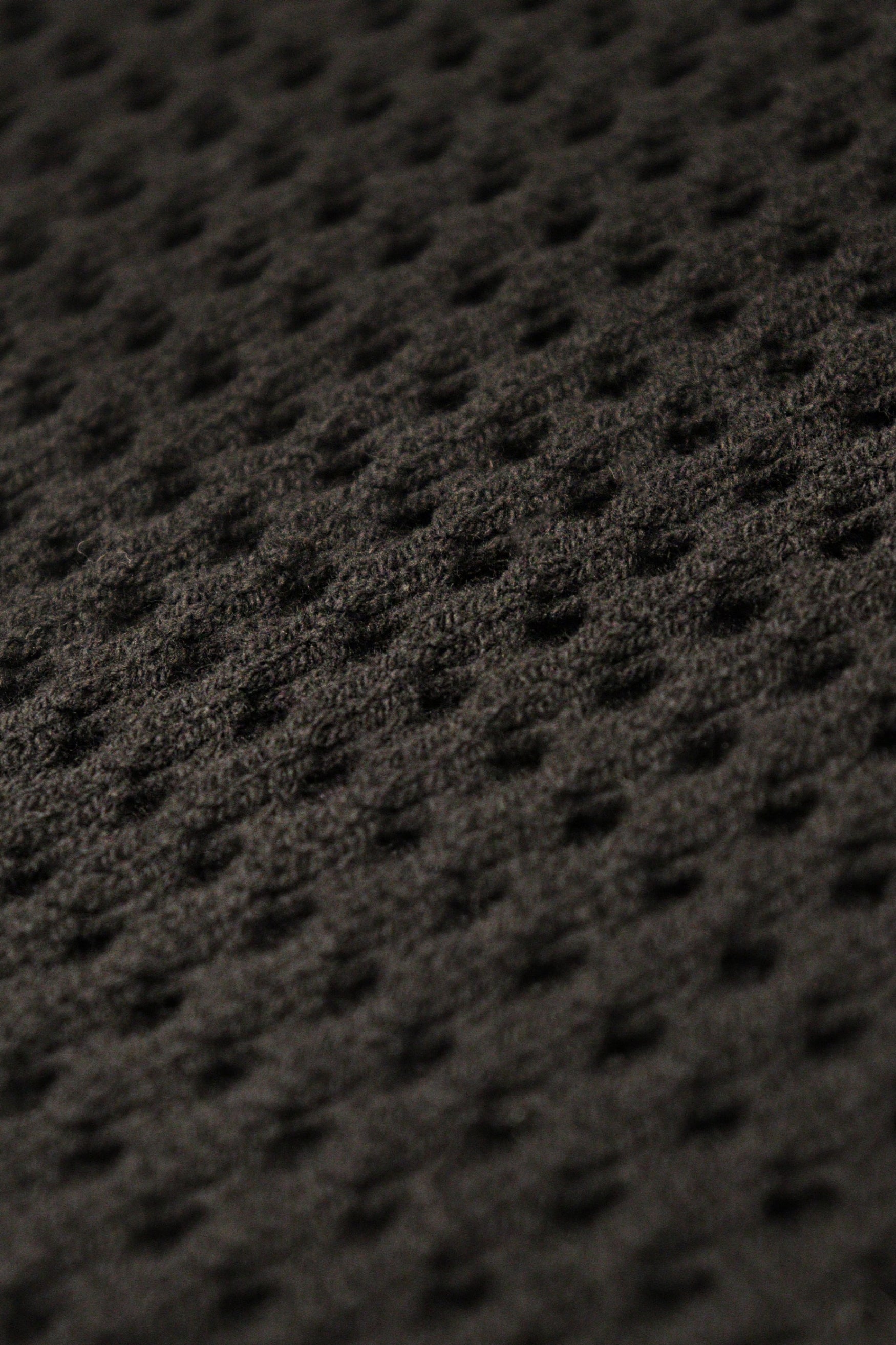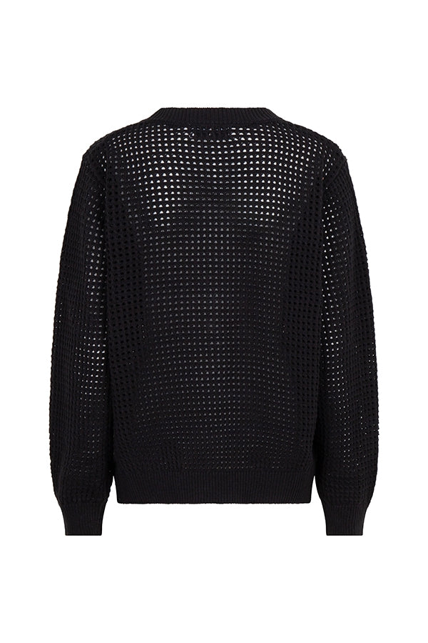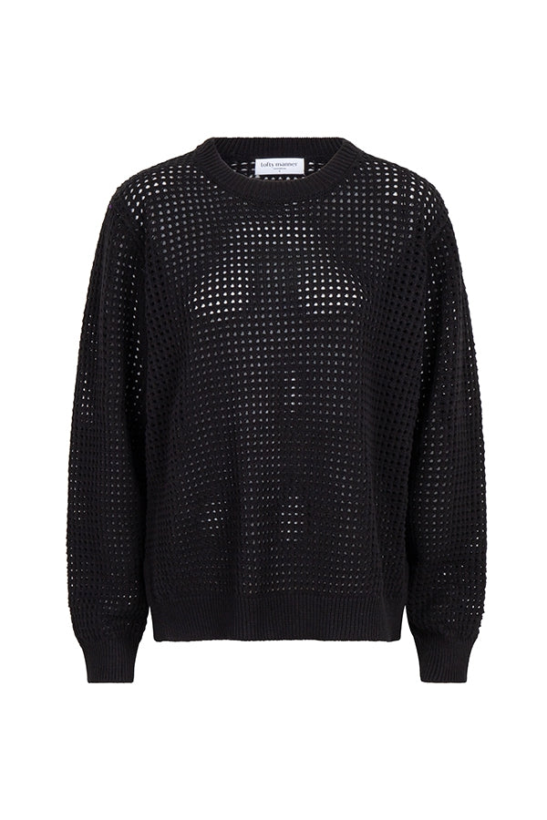 Le pull Sia est un pull noir ample à col rond et dont le tissu ajouré procure un subtil effet de transparence.