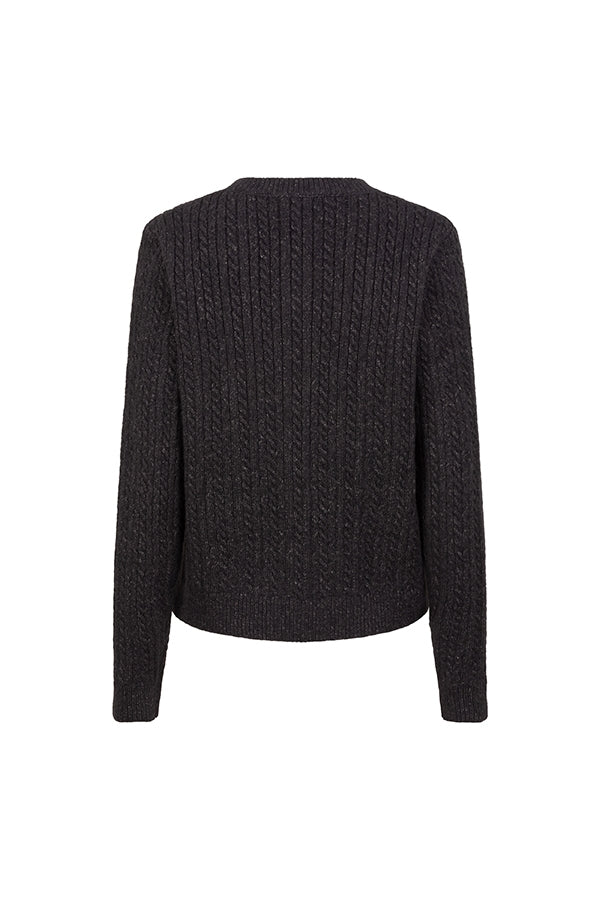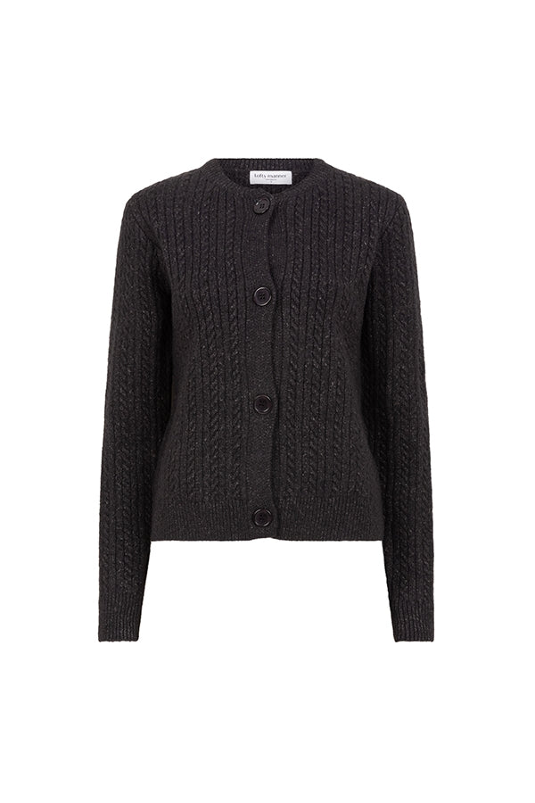 Le cardigan Niva est un cardigan noir en maille texturée. Il présente un col rond haut et une grande élasticité. Sa coupe est ample.