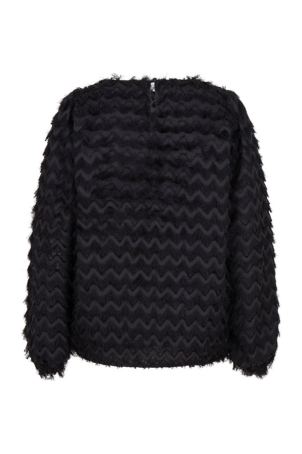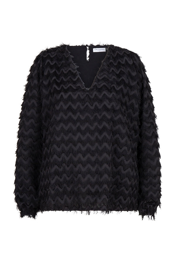 Blouse Cathy is een losvallende zwarte blouse met een V-hals en subtiele pofmouwen. De blouse heeft elastiek bij de mouwuiteinden en franjes als details.
