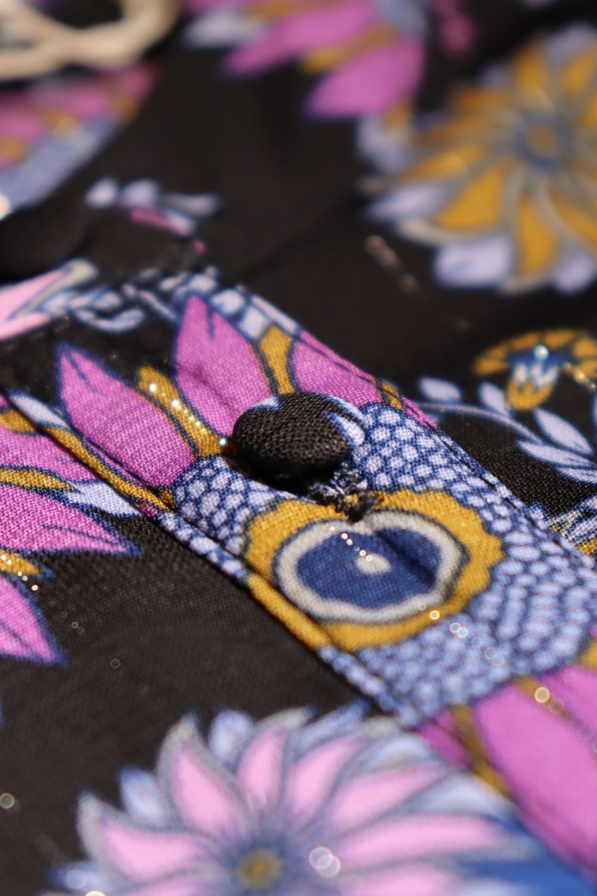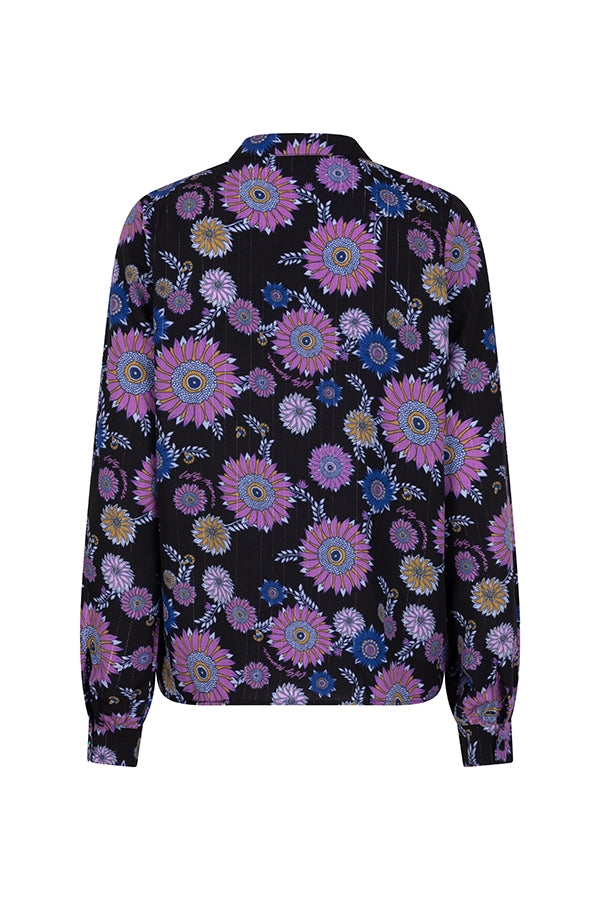Blouse Emese is een zwarte blouse met paarsblauwe bloemenprint. De blouse heeft een Henley-kraag, knoopsluiting over de gehele lengte en knoopjes bij de mouwuiteinden. Ook heeft de blouse een subtiele glinstering dankzij de lurexdetails. De blouse met bloemenprint is qua pasvorm losvallend.