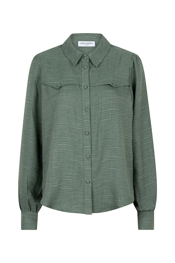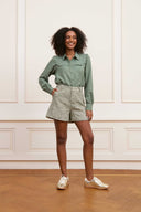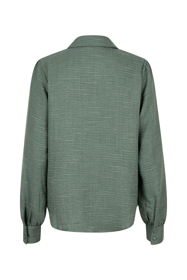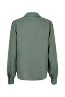 Blouse Josephine is een klassieke groene blouse. De blouse heeft een platte kraag, aansluitende mouwuiteinden en sierzakken op de voorkant.