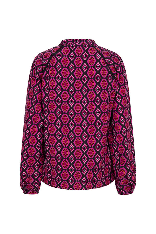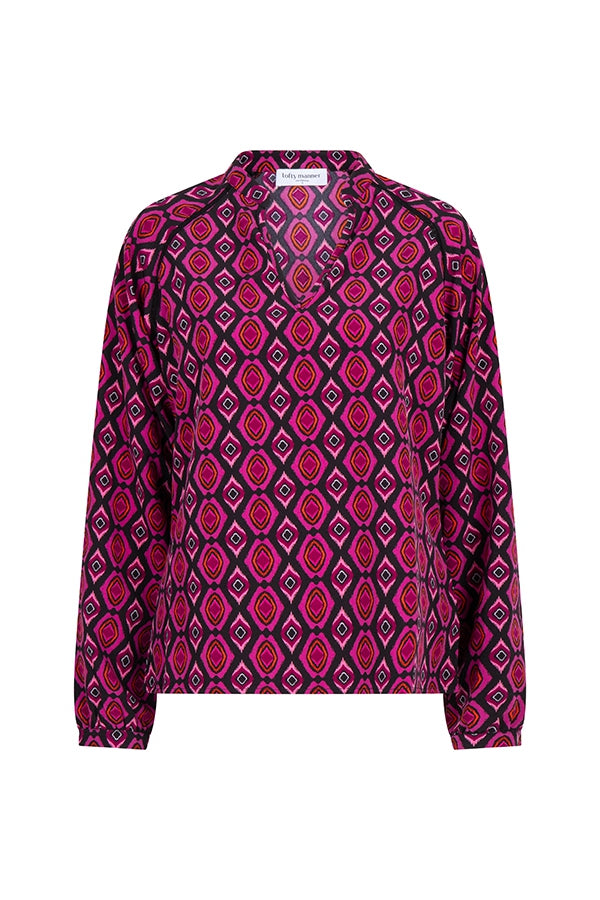Blouse Rowyn is een kleurrijke blouse met een kleine V-hals en een opstaand kraagje. De blouse heeft een knoopje bij de mouwuiteinden en een rechtvallende pasvorm. Op de schouders zit een tape detail.