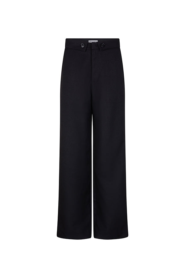 Broek Amelia is een zwarte pantalon met knoopdetail op de tailleband. De zwarte broek heeft steekzakken aan de zijkant en sierzakken aan de achterkant. Verder heeft de broek een hook & eye en ritssluiting en is de pantalon qua pasvorm rechtvallend.