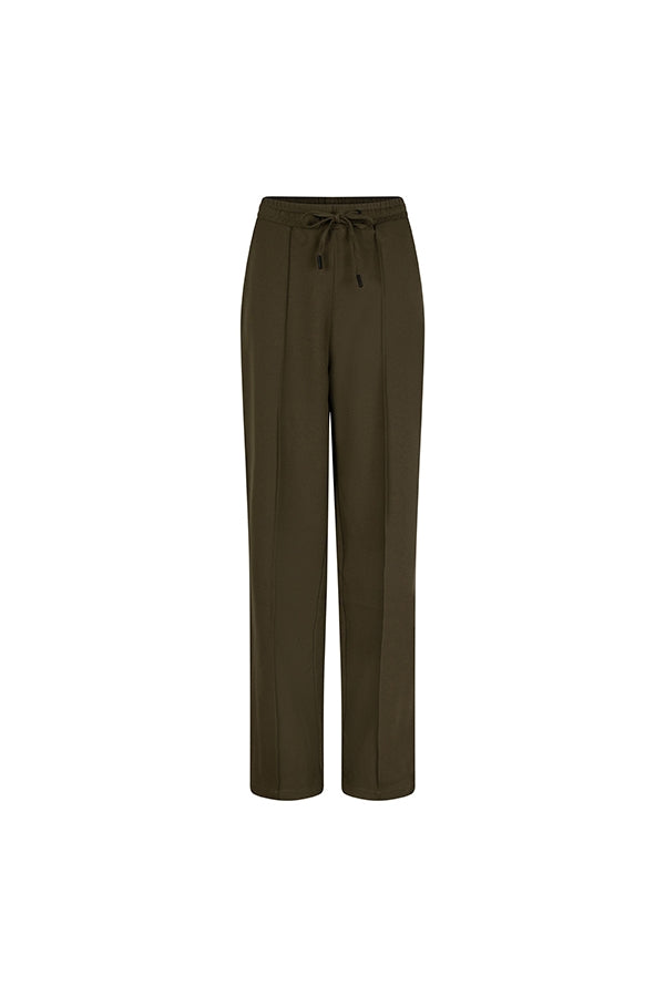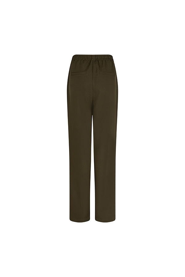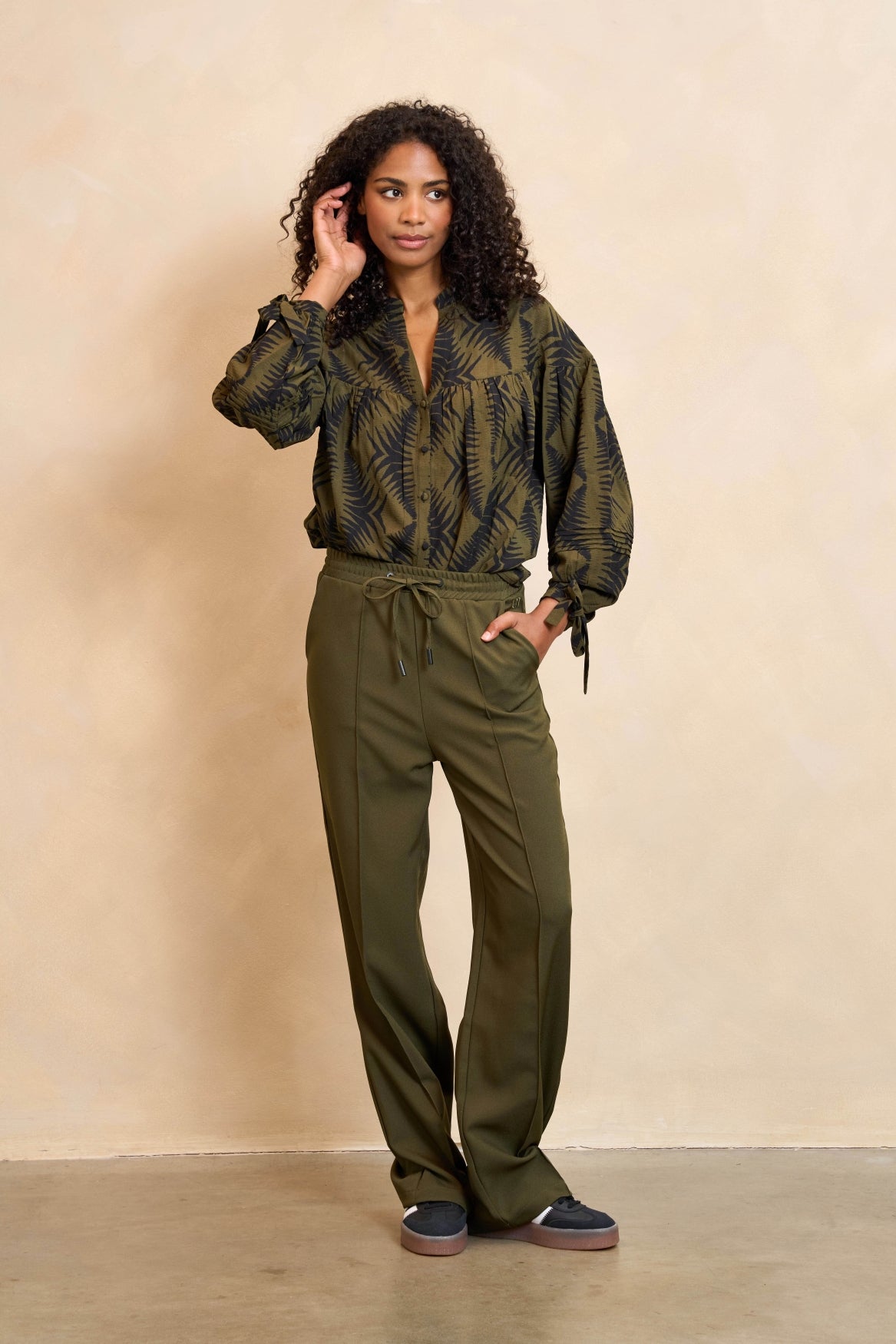 Broek Ammelin is een sportieve groene pantalon. De broek heeft een decoratieve naad op de voorkant en een elastieken tailleband van smock met trekkoord. De sportieve broek heeft zowel steek- als paspelzakken en is gemaakt van een stevige tof. De groene broek bevat veel stretch en is qua pasvorm rechtvallend.