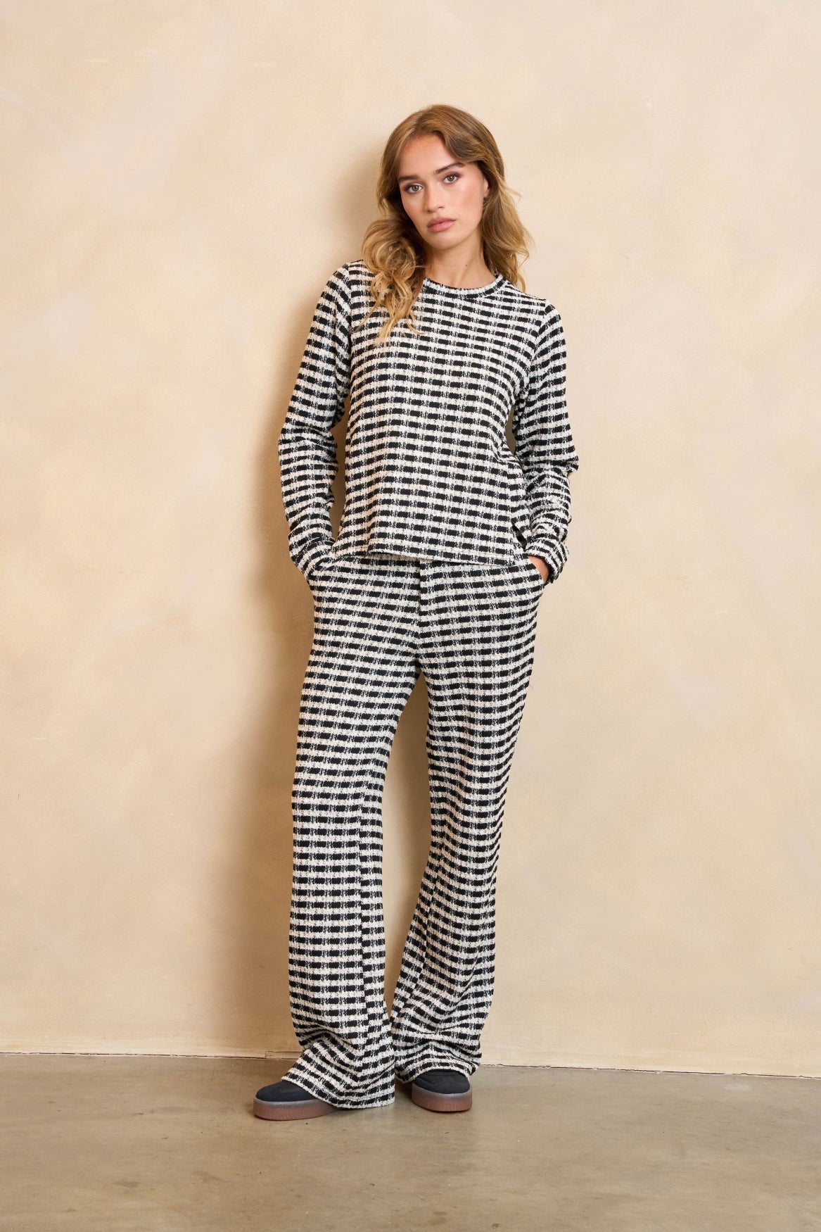 Broek Dakota is een ruitjesbroek van tweed stof. De broek met print heeft een elastieken tailleband, zowel steek- als paspelzakken en bevat veel stretch. De broek is qua pasvorm rechtvallend.
