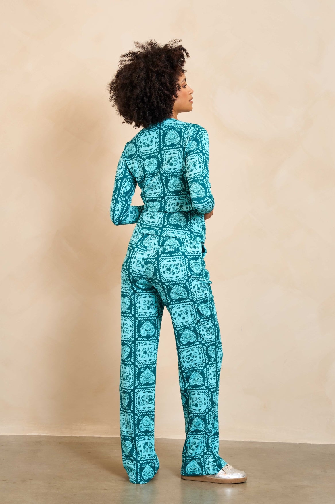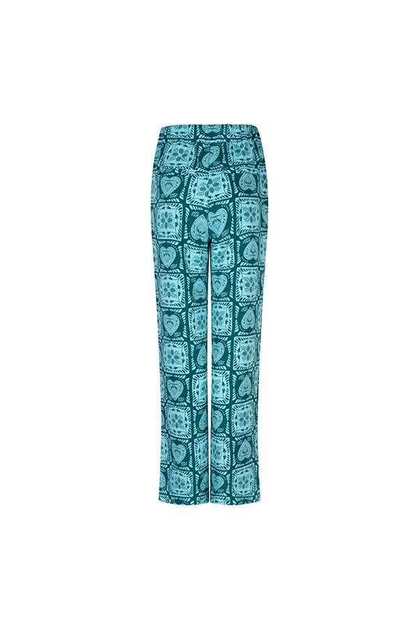 Broek Icelee is een teal broek met print, rechte pijpen en een elastische tailleband. De broek valt relaxed. Een opvallende item die perfect matcht met een effen top of als co-ord set met top Aven.