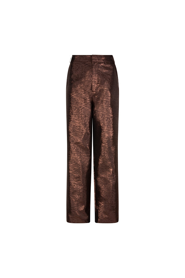 Broek Jane is een bruine broek van jacquard stof. De broek met luxe uitstraling heeft zowel steek- als paspelzakken en een hook & eye- en ritssluiting. De bruine broek is qua pasvorm rechtvallend.