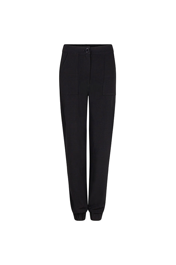 Broek Maeve is een zwarte high waisted cargobroek gemaakt van een zwaardere stretchstof. De broek heeft aan de voorkant grote opvallende steekzakken en aan de onderkant van de broekspijpen elastiek.