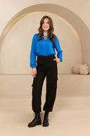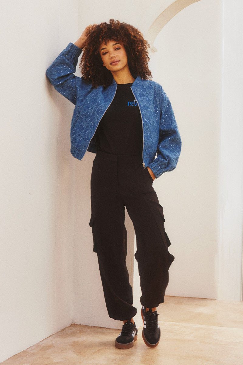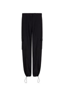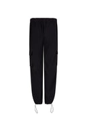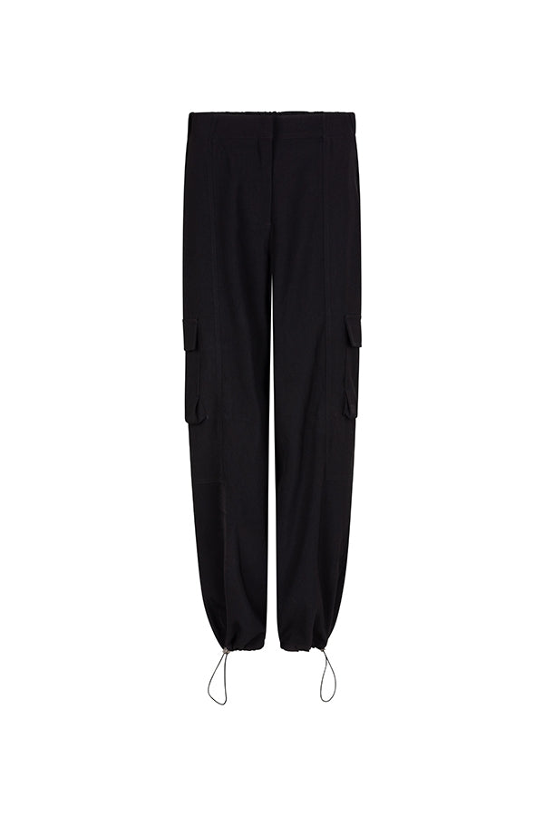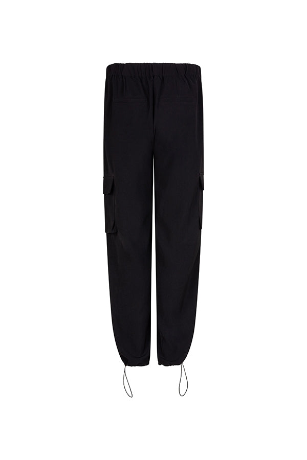 Broek Nahla is een zwarte cargobroek met trekkoord bij de broekspijpen. De zwarte broek heeft cargozakken, steekzakken en sierzakken aan de achterkant. De broek is qua fit losvallend.