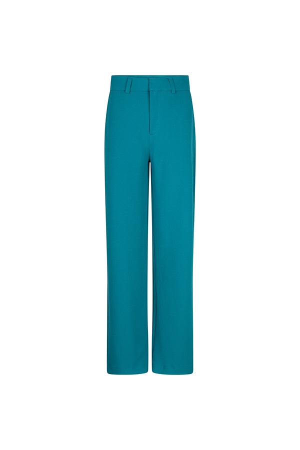 Broek Nova is een rechtvallende broek met stretch en een stevige elastische tailleband. De blauwe pantalon is voorzien van steekzakken aan de zijkant, riemlussen, een hook-and-eye sluiting en sierzakken aan de achterkant.