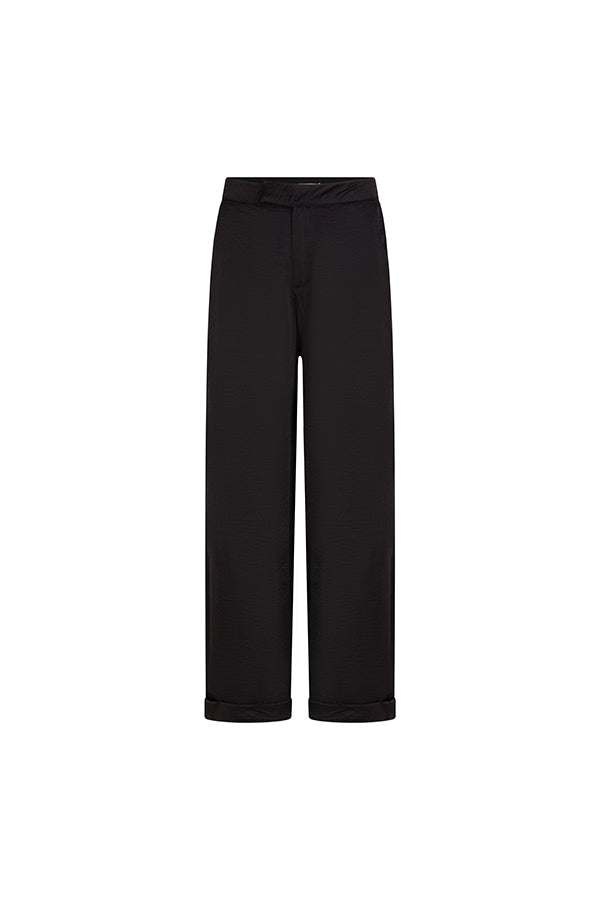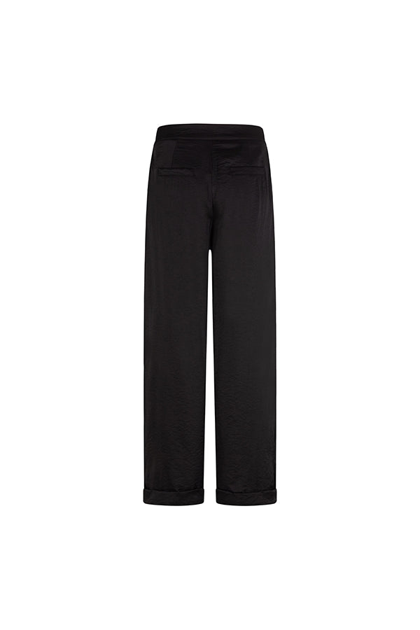 Broek Svea is een zwarte broek met satijnen look. De broek heeft omgeslagen broekspijpen, zowel steek- als paspelzakken en een hook & eye- en ritssluiting. De zwarte broek is qua pasvorm rechtvallend.