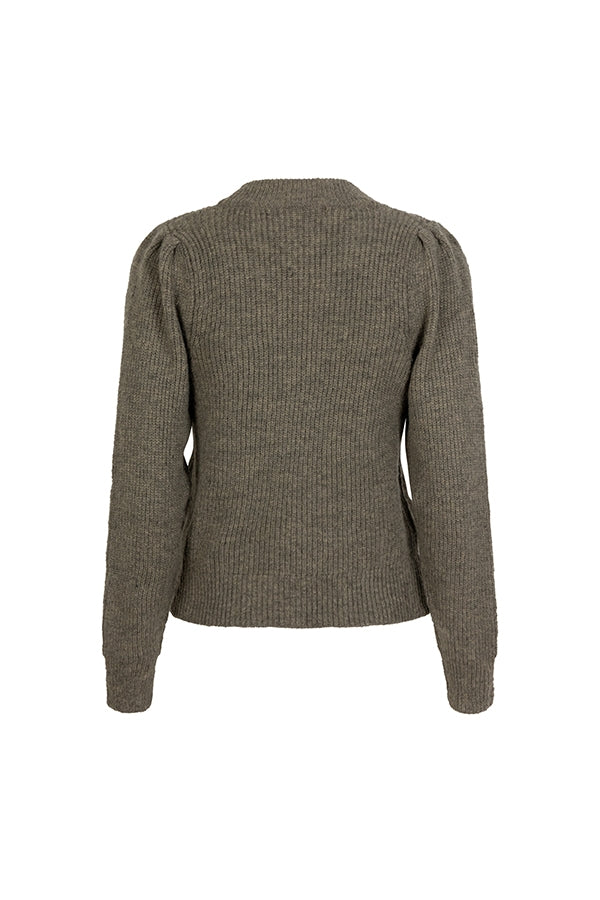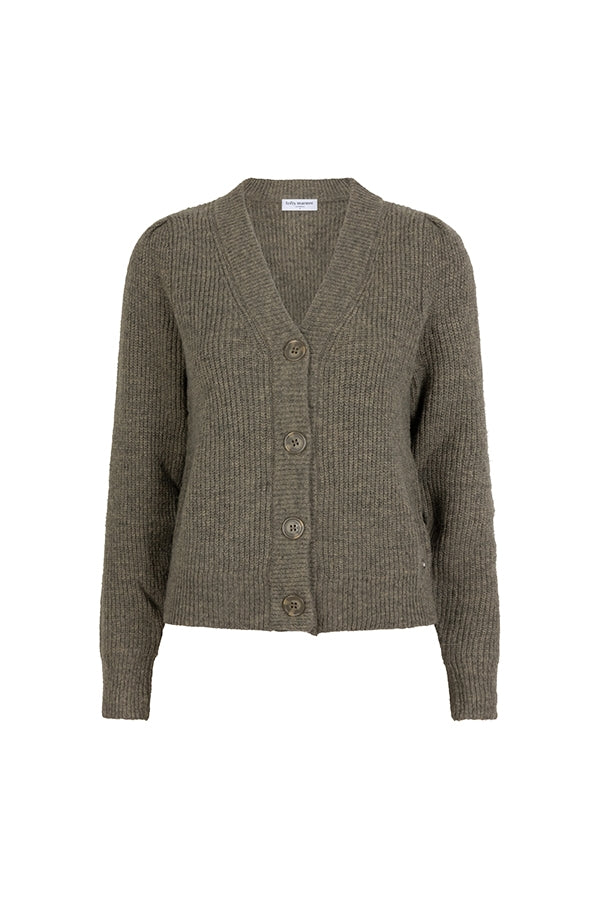Vest Indie is een groen gebreid vest met knoopsluiting. Het gebreide vest heeft een V-hals, subtiele pofmouwen en is qua pasvorm rechtvallend.