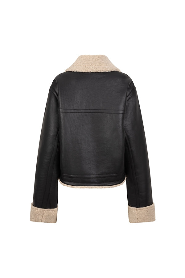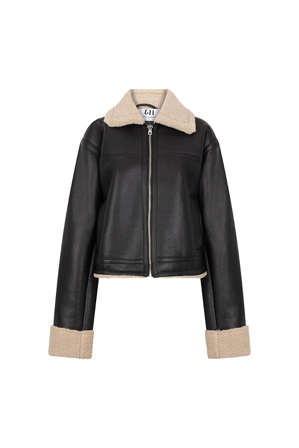 Jas Ruby is een zwarte leather look jas met liggende kraag. De zwarte jas heeft teddy stof bij zowel de kraag als omgeslagen mouwuiteinden, steekzakken en een ritssluiting. De lammy coat is qua pasvorm rechtvallend.