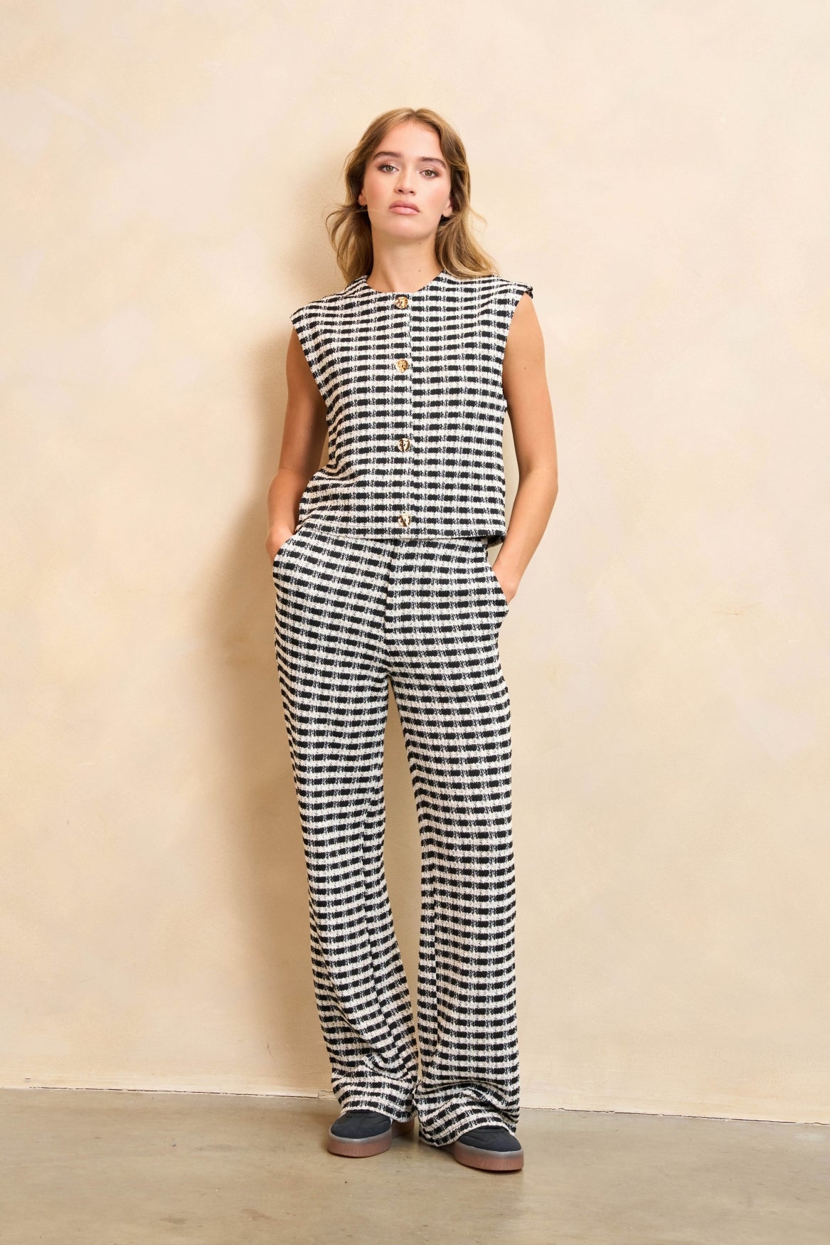 Gilet Kendal is een zwart-wit gilet van tweed stof. Het mouwloze jasje heeft een ronde hals, kapmouwtjes en knoopsluiting. Het gilet bevat stretch en is qua pasvorm rechtvallend.