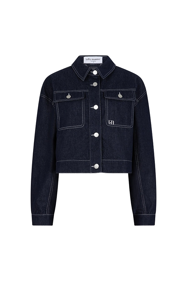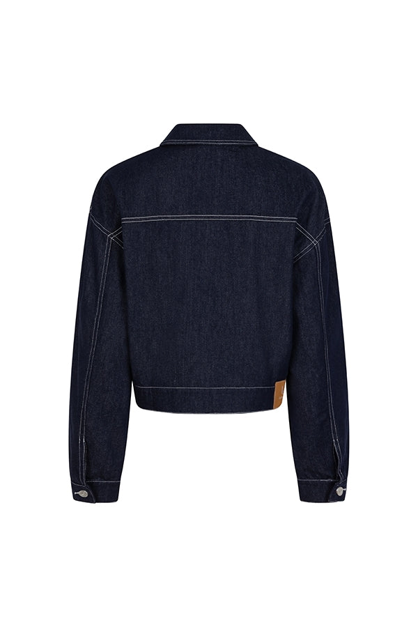 Jacket Ariah is een donkerblauw denim jasje. Het korte blauwe jasje heeft een klassieke kraag, borstzakken en een knoopsluiting. Verder heeft het jasje het Lofty Manner monogram op de borstzak en contrasterende stiksels. Het denim jasje is qua pasvorm losvallend.