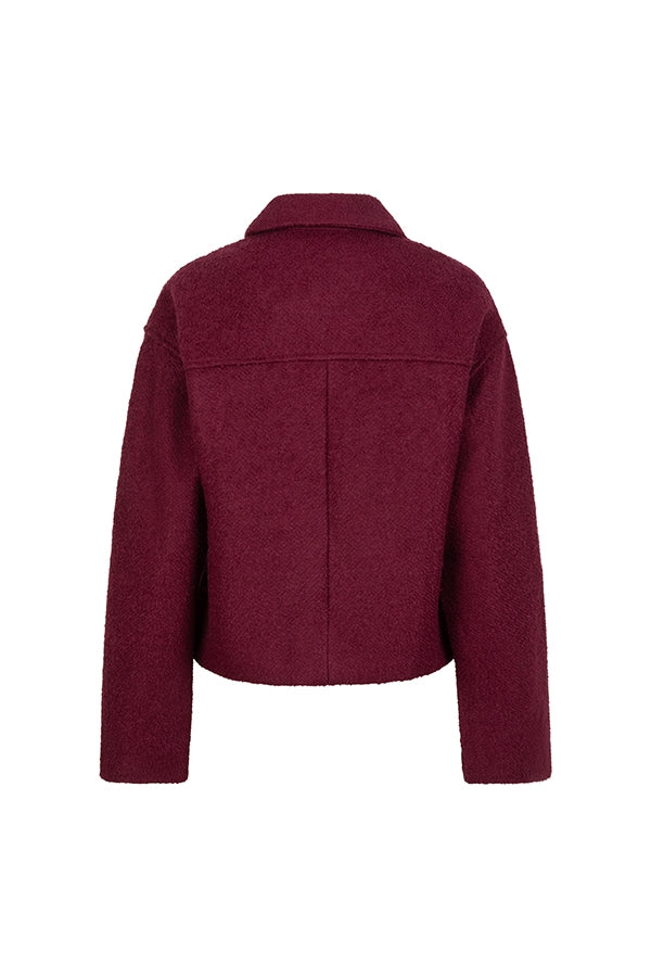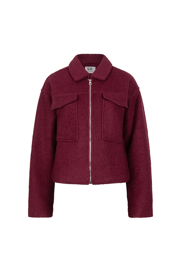 Jacket Liselotte is een bordeauxrood jasje met boxy fit. Het jasje heeft borstzakken, een ritssluiting en een liggende kraag. Het rode jasje is gemaakt van een stevige stof en is qua pasvorm losvallend.