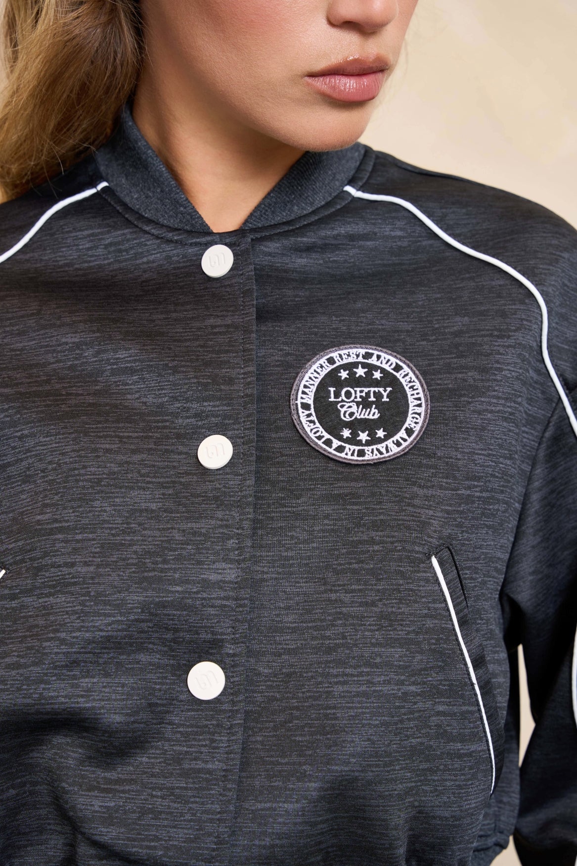 Jacket Maia is een kort grijs baseball jasje. Het groene jasje heeft een smock tailleband, opstaande ribkraag, steekzakken en drukknopen. Verder heeft het baseball jasje een patch op de borst. Het grijze jasje is qua pasvorm losvallend.
