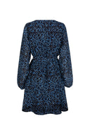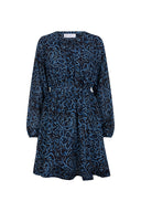Jurk Imane is een blauwe korte jurk met print. De jurk heeft een rijgdetail bij de V-hals en elastiek en afneembare riem in de taille. De jurk is qua fit losvallend.