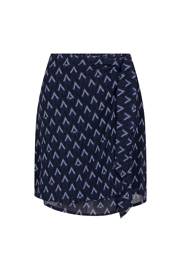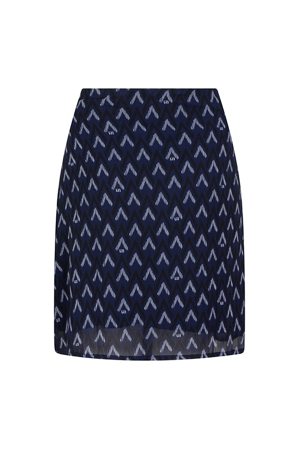 Rok Carol is een korte rok met zigzag print. De rok is gemaakt van een geweven stof met patroon, heeft een overslag en knoopdetail aan de linker draagkant. De blauwe rok heeft een blinde rits aan de zijkant en is qua pasvorm rechtvallend.