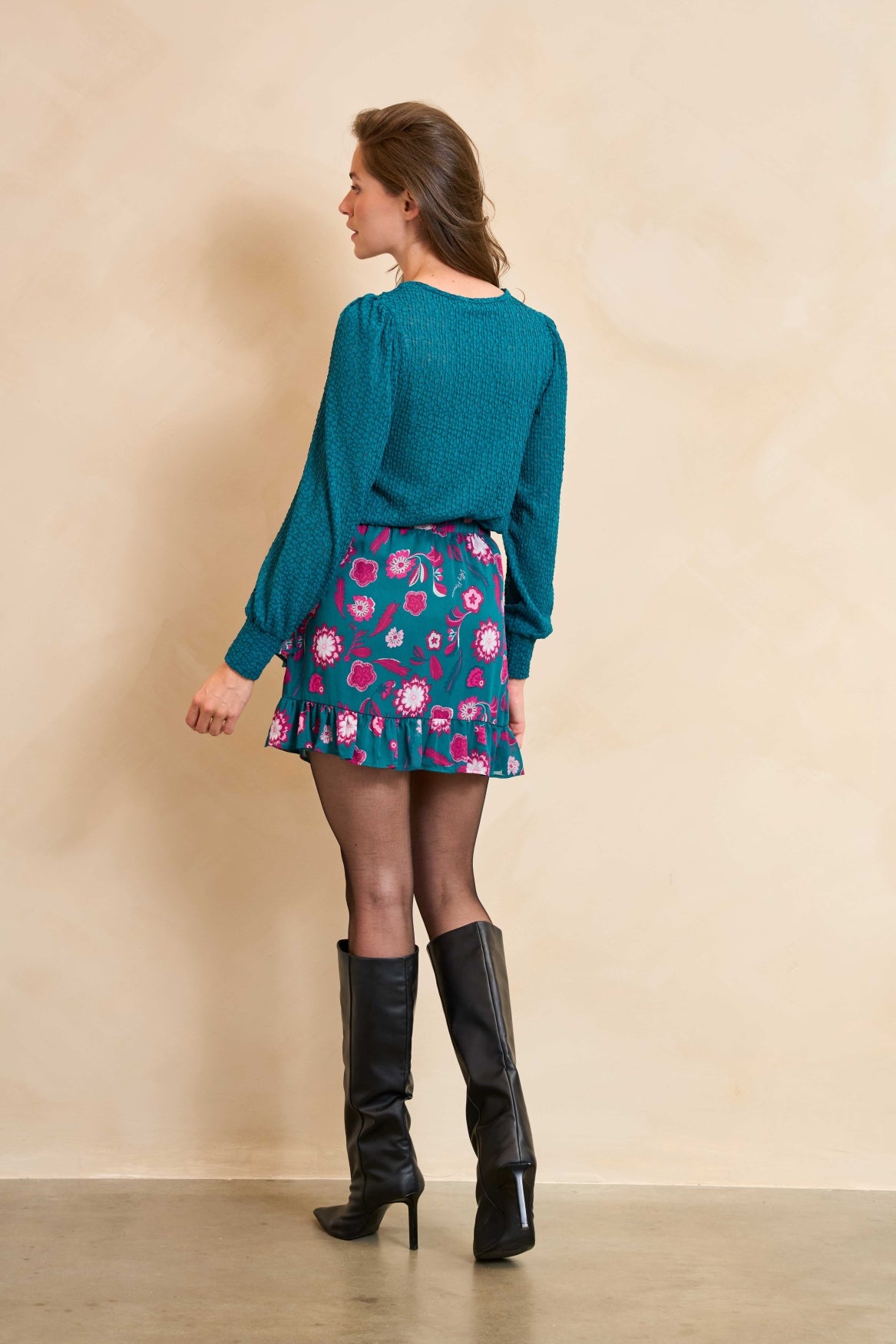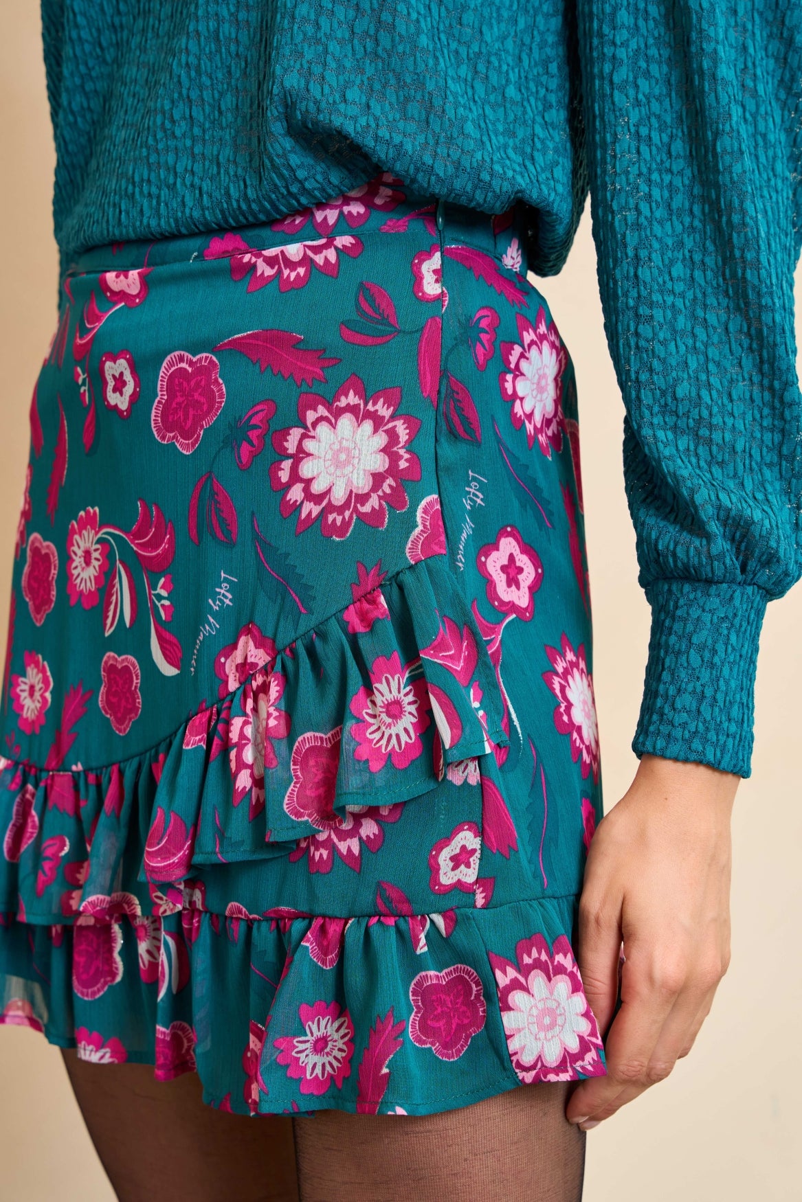 Rok Thirza is een korte rok met print en een speels ruffle detail. De elastische tailleband zorgt voor een comfortabele pasvorm. De rok valt mooi om het lichaam en laat zich makkelijk combineren met een effen top of blouse.
