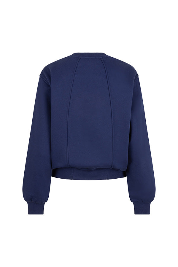 Sweater Emmy is blauwe sweater met design. De blauwe New York-sweater heeft een hoge ronde hals, aangesloten mouwuiteinden en een fijne fleecestof aan de binnenkant. De blauwe trui is qua pasvorm oversized.