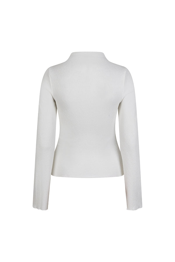 Top Amber is een witte aangesloten top. De top heeft een opstaande kraag en bevat veel stretch.
