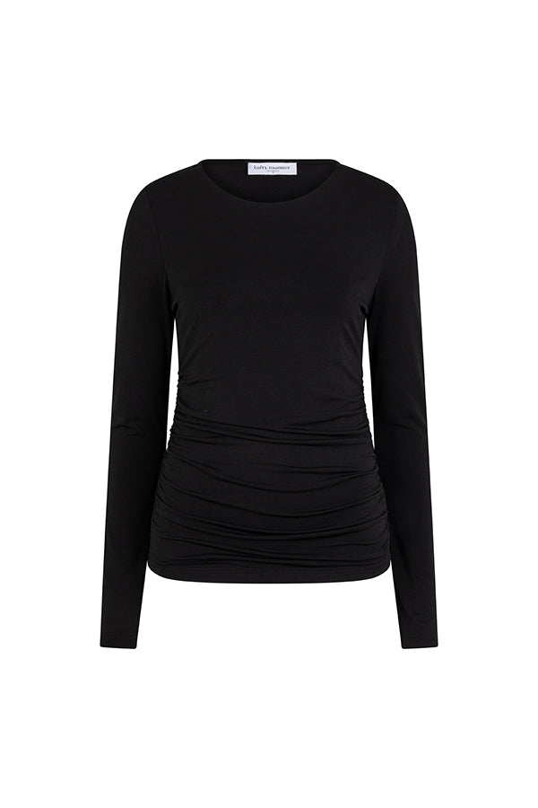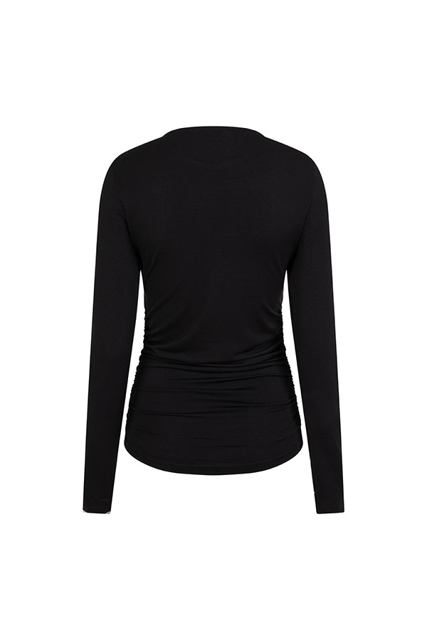 Top Celine is een zwarte top met ronde hals. De aangesloten top heeft aan de zijkant een geplooid effect, wat de top net even anders maakt. De zwarte top bevat veel stretch.