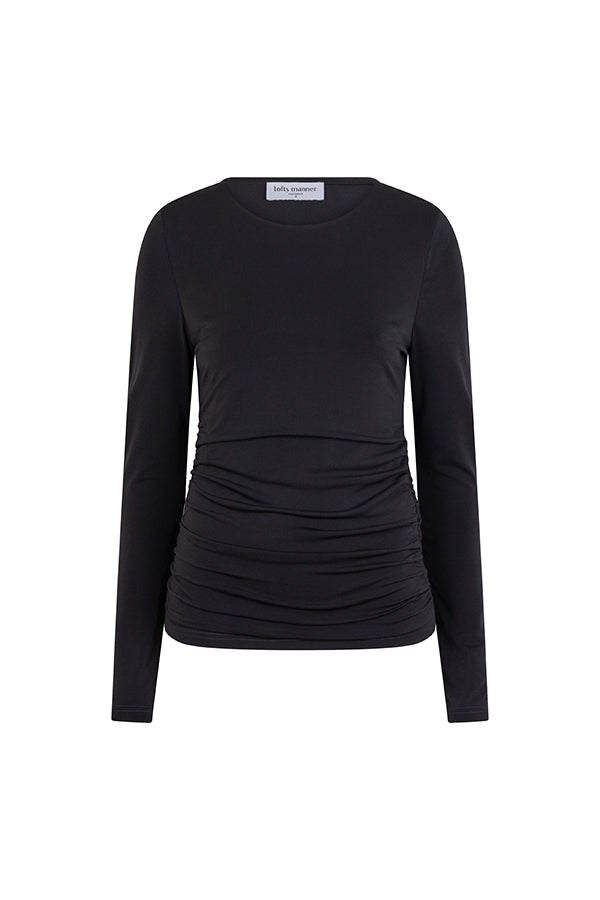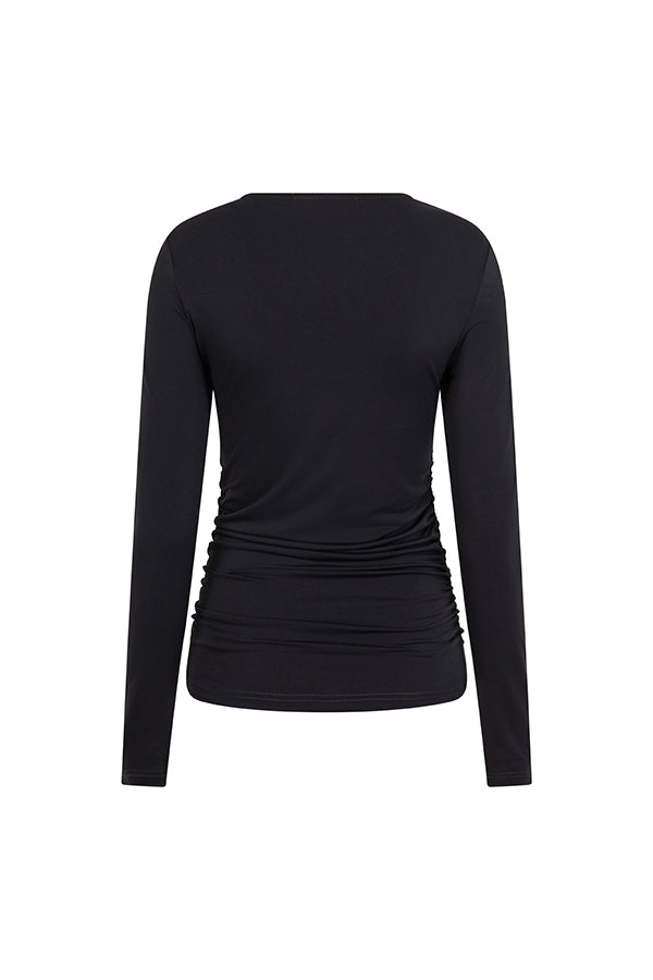 Top Celine is een donkergrijze top met ronde hals. De aangesloten top heeft aan de zijkant een geplooid effect, wat de top net even anders maakt. De donkergrijze top bevat veel stretch.